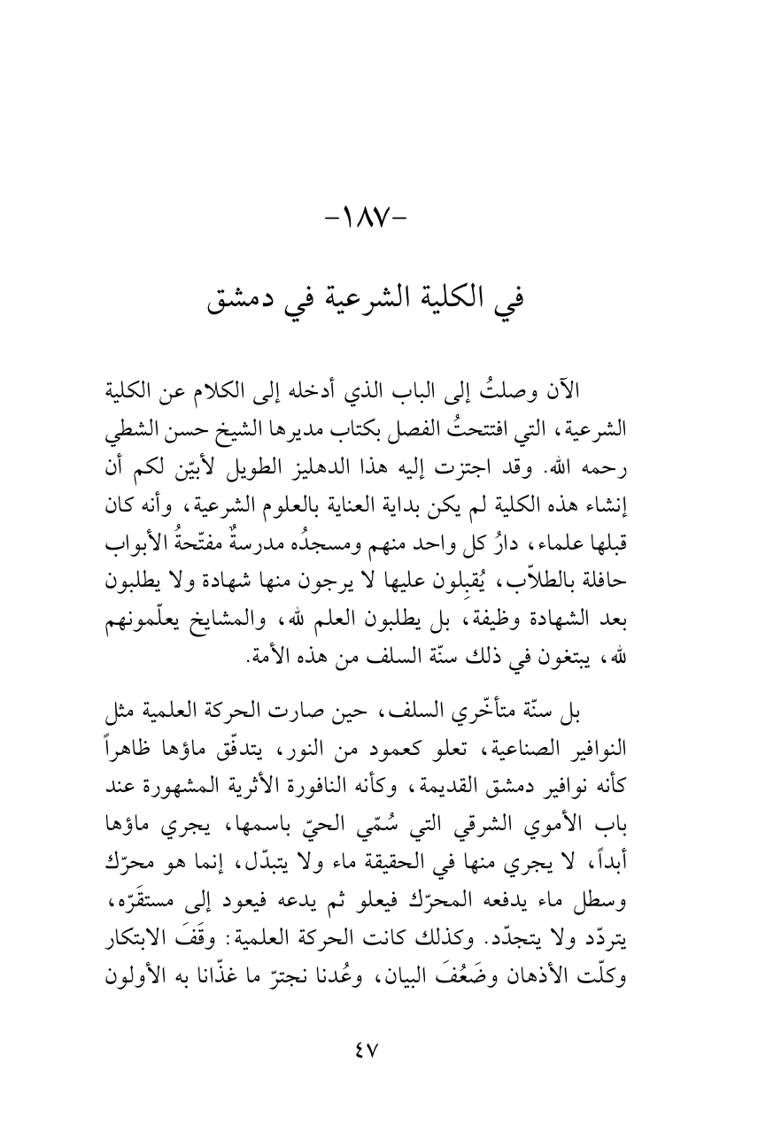 بل سنّة متأخّري السلف، حين صارت الحركة العلمية مثل النوافير الصناعية، تعلو كعمود من النور، يتدفّق ماؤها ظاهراً كأنه نوافير دمشق القديمة، وكأنه النافورة الأثرية المشهورة عند باب الأموي الشرقي التي سُمّي الحيّ باسمها، يجري ماؤها أبداً، لا يجري منها في الحقيقة ماء ولا يتبدّل، إنما هو محرّك وسطل ماء يدفعه المحرّك فيعلو ثم يدعه فيعود إلى مستقَرّه، يتردّد ولا يتجدّد. وكذلك كانت الحركة العلمية: وقَفَ الابتكار وكلّت الأذهان وضَعُفَ البيان، وعُدنا نجترّ ما غذّانا به الأولون