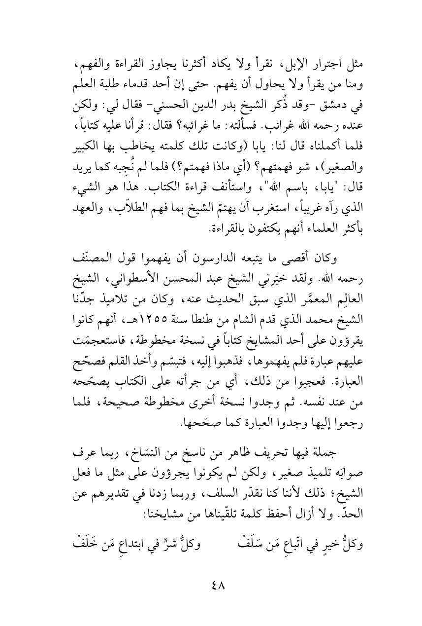 وكان أقصى ما يتبعه الدارسون أن يفهموا قول المصنّف رحمه الله. ولقد خبّرني الشيخ عبد المحسن الأسطواني، الشيخ العالِم المعمَّر الذي سبق الحديث عنه، وكان من تلاميذ جدّنا الشيخ محمد الذي قدم الشام من طنطا سنة 1255هـ، أنهم كانوا يقرؤون على أحد المشايخ كتاباً في نسخة مخطوطة، فاستعجمَت عليهم عبارة فلم يفهموها، فذهبوا إليه، فتبسّم وأخذ القلم فصحّح العبارة. فعجبوا من ذلك، أي من جرأته على الكتاب يصحّحه من عند نفسه. ثم وجدوا نسخة أخرى مخطوطة صحيحة، فلما رجعوا إليها وجدوا العبارة كما صحّحها.