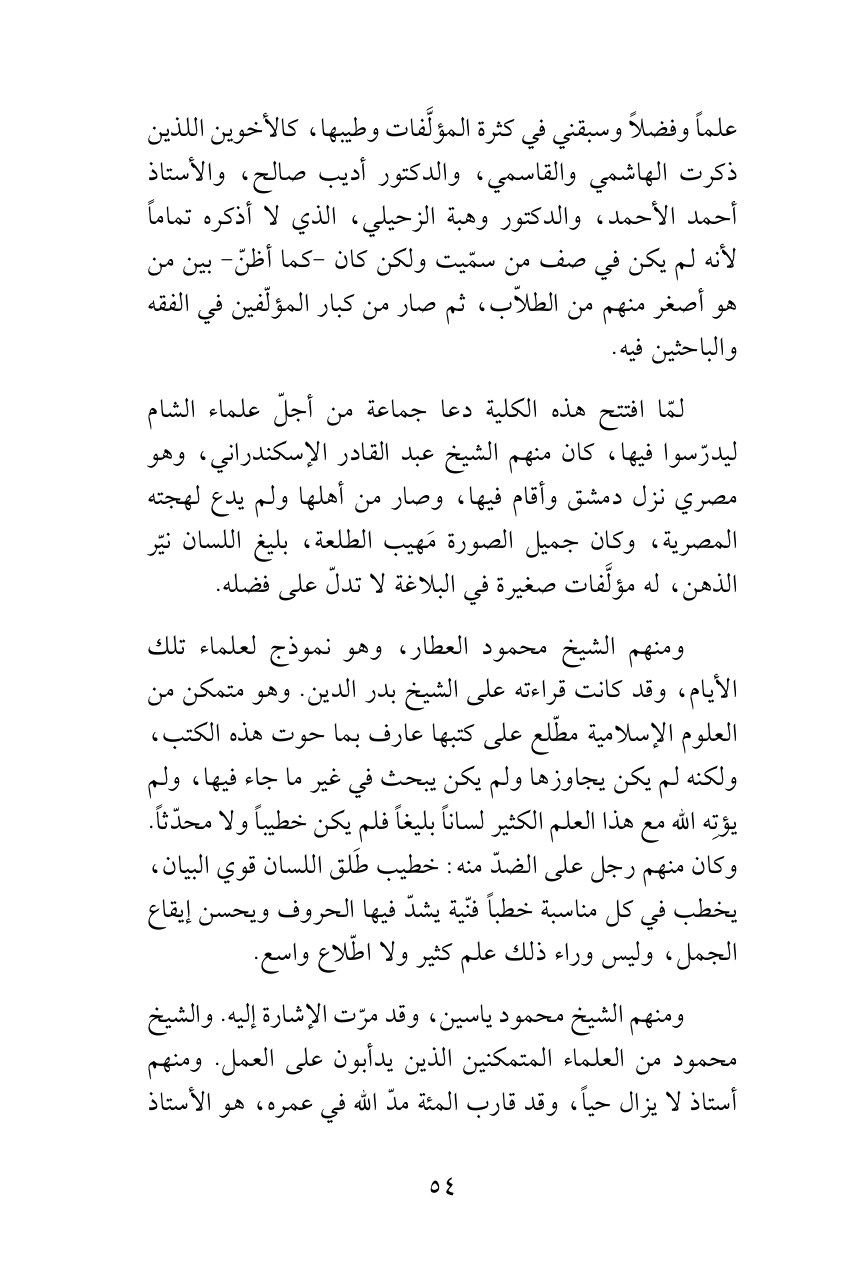 علماً وفضلاً وسبقني في كثرة المؤلَّفات وطيبها، كالأخوين اللذين ذكرت الهاشمي والقاسمي، والدكتور أديب صالح، والأستاذ أحمد الأحمد، والدكتور وهبة الزحيلي، الذي لا أذكره تماماً لأنه لم يكن في صف من سمّيت ولكن كان -كما أظنّ- بين من هو أصغر منهم من الطلاّب، ثم صار من كبار المؤلّفين في الفقه والباحثين فيه.