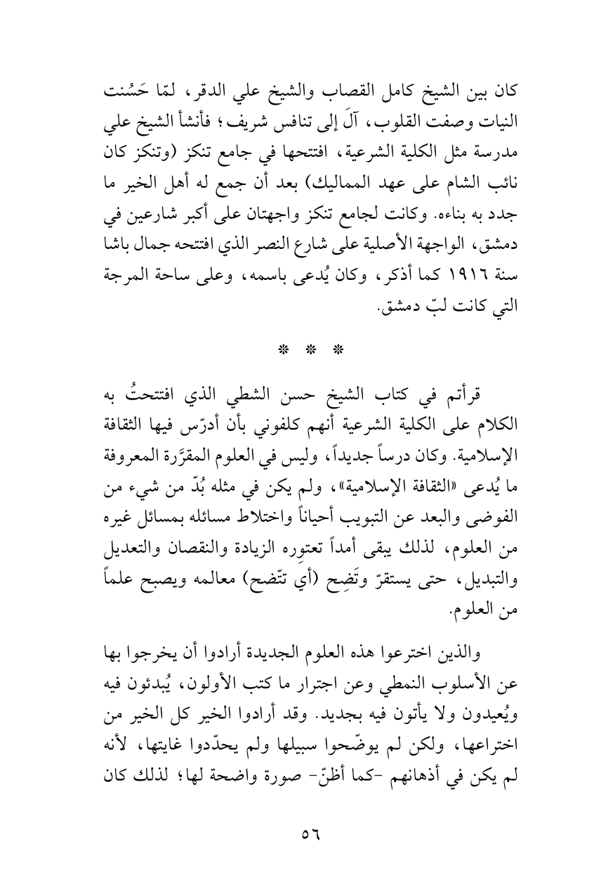 قرأتم في كتاب الشيخ حسن الشطي الذي افتتحتُ به الكلام على الكلية الشرعية أنهم كلفوني بأن أدرّس فيها الثقافة الإسلامية. وكان درساً جديداً، وليس في العلوم المقرَّرة المعروفة ما يُدعى «الثقافة الإسلامية»، ولم يكن في مثله بُدّ من شيء من الفوضى والبعد عن التبويب أحياناً واختلاط مسائله بمسائل غيره من العلوم، لذلك يبقى أمداً تعتوِره الزيادة والنقصان والتعديل والتبديل، حتى يستقرّ وتَضِح (أي تتّضح) معالمه ويصبح علماً من العلوم.