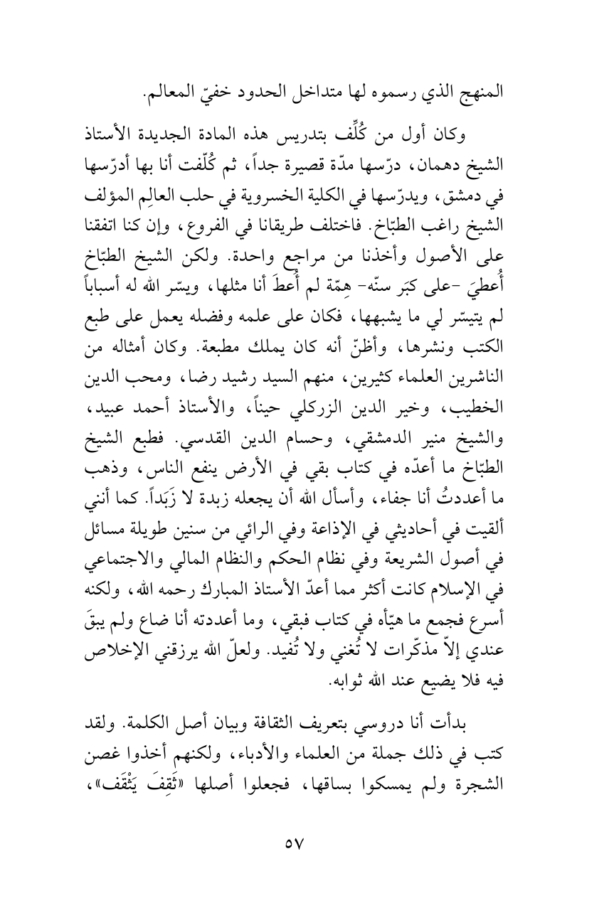 وكان أول من كُلِّف بتدريس هذه المادة الجديدة الأستاذ الشيخ دهمان، درّسها مدّة قصيرة جداً، ثم كُلّفت أنا بها أدرّسها في دمشق، ويدرّسها في الكلية الخسروية في حلب العالِم المؤلف الشيخ راغب الطبّاخ. فاختلف طريقانا في الفروع، وإن كنا اتفقنا على الأصول وأخذنا من مراجع واحدة. ولكن الشيخ الطبّاخ أُعطيَ -على كبَر سنّه- هِمّة لم أُعطَ أنا مثلها، ويسّر الله له أسباباً لم يتيسّر لي ما يشبهها، فكان على علمه وفضله يعمل على طبع الكتب ونشرها، وأظنّ أنه كان يملك مطبعة. وكان أمثاله من الناشرين العلماء كثيرين، منهم السيد رشيد رضا، ومحب الدين الخطيب، وخير الدين الزركلي حيناً، والأستاذ أحمد عبيد، والشيخ منير الدمشقي، وحسام الدين القدسي. فطبع الشيخ الطبّاخ ما أعدّه في كتاب بقي في الأرض ينفع الناس، وذهب ما أعددتُ أنا جفاء، وأسأل الله أن يجعله زبدة لا زَبَداً. كما أنني ألقيت في أحاديثي في الإذاعة وفي الرائي من سنين طويلة مسائل في أصول الشريعة وفي نظام الحكم والنظام المالي والاجتماعي في الإسلام كانت أكثر مما أعدّ الأستاذ المبارك رحمه الله، ولكنه أسرع فجمع ما هيّأه في كتاب فبقي، وما أعددته أنا ضاع ولم يبقَ عندي إلاّ مذكّرات لا تُغني ولا تُفيد. ولعلّ الله يرزقني الإخلاص فيه فلا يضيع عند الله ثوابه.