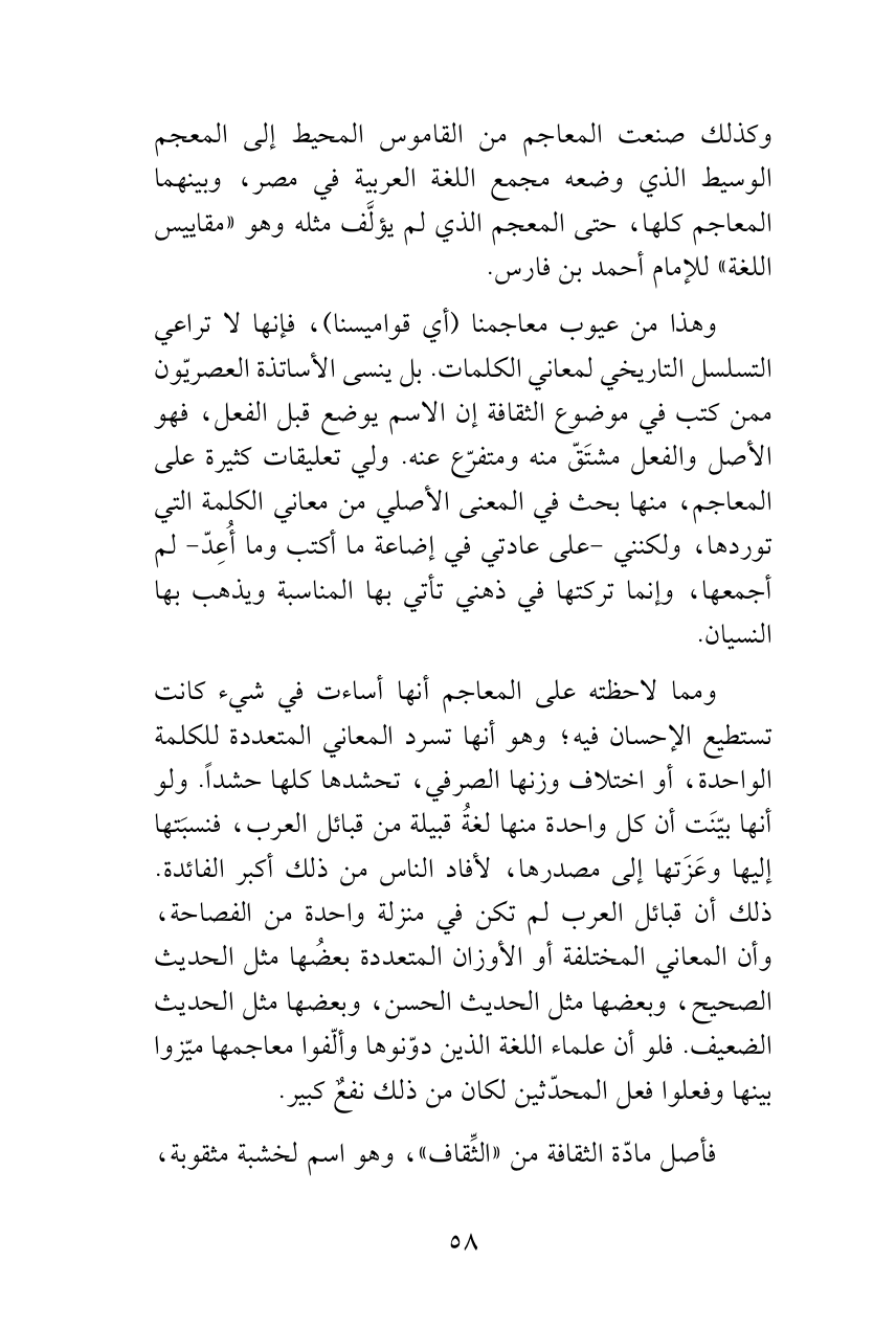 وهذا من عيوب معاجمنا (أي قواميسنا)، فإنها لا تراعي التسلسل التاريخي لمعاني الكلمات. بل ينسى الأساتذة العصريّون ممن كتب في موضوع الثقافة إن الاسم يوضع قبل الفعل، فهو الأصل والفعل مشتَقّ منه ومتفرّع عنه. ولي تعليقات كثيرة على المعاجم، منها بحث في المعنى الأصلي من معاني الكلمة التي توردها، ولكنني -على عادتي في إضاعة ما أكتب وما أُعِدّ- لم أجمعها، وإنما تركتها في ذهني تأتي بها المناسبة ويذهب بها النسيان.
