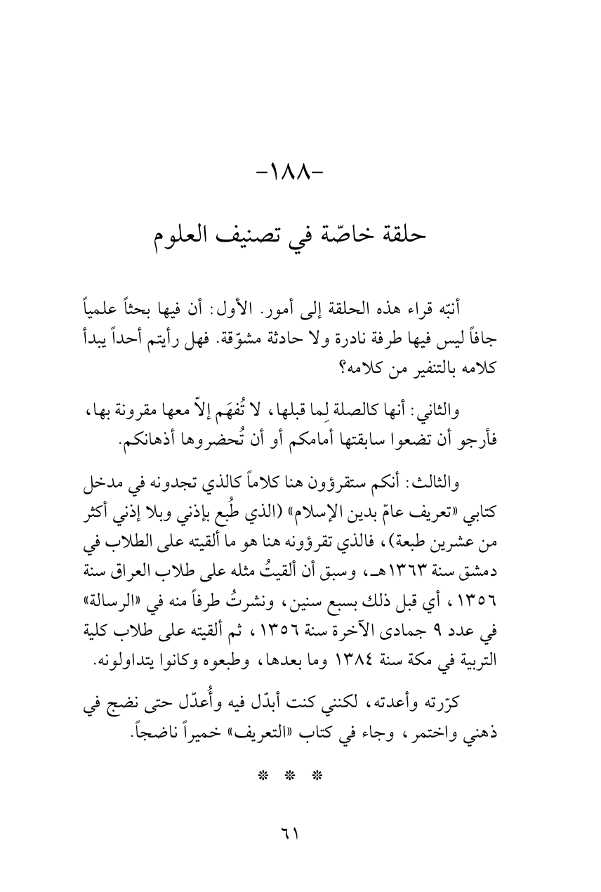 والثالث: أنكم ستقرؤون هنا كلاماً كالذي تجدونه في مدخل كتابي «تعريف عامّ بدين الإسلام» (الذي طُبع بإذني وبلا إذني أكثر من عشرين طبعة)، فالذي تقرؤونه هنا هو ما ألقيته على الطلاب في دمشق سنة 1363هـ، وسبق أن ألقيتُ مثله على طلاب العراق سنة 1356، أي قبل ذلك بسبع سنين، ونشرتُ طرفاً منه في «الرسالة» في عدد 9 جمادى الآخرة سنة 1356، ثم ألقيته على طلاب كلية التربية في مكة سنة 1384 وما بعدها، وطبعوه وكانوا يتداولونه.