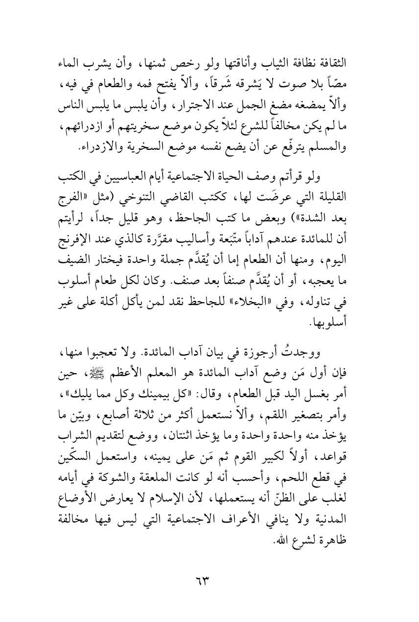 ولو قرأتم وصف الحياة الاجتماعية أيام العباسيين في الكتب القليلة التي عرضَت لها، ككتب القاضي التنوخي (مثل «الفرج بعد الشدة») وبعض ما كتب الجاحظ، وهو قليل جداً، لرأيتم أن للمائدة عندهم آداباً متّبَعة وأساليب مقرَّرة كالذي عند الإفرنج اليوم، ومنها أن الطعام إما أن يُقدَّم جملة واحدة فيختار الضيف ما يعجبه، أو أن يُقدَّم صنفاً بعد صنف. وكان لكل طعام أسلوب في تناوله، وفي «البخلاء» للجاحظ نقد لمن يأكل أكلة على غير أسلوبها.