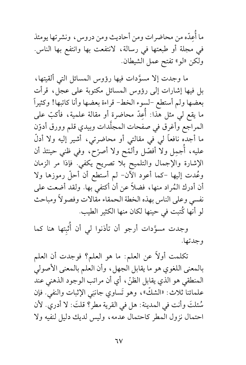 ما وجدت إلا مسوَّدات فيها رؤوس المسائل التي ألقيتها، بل فيها إشارات إلى رؤوس المسائل مكتوبة على عجل، قرأت بعضها ولم أستطع -لسوء الخط- قراءة بعضها وأنا كاتبها! وكثيراً ما يقع لي مثل هذا: أُعِدّ محاضرة أو مقالة علمية، فأكبّ على المراجع وأغرق في صفحات المجلَّدات وبيدي قلم وورق أدوّن ما أجده نافعاً لي في مقالتي أو محاضرتي، أشير إليه ولا أدلّ عليه، أُجمِل ولا أفصّل وألمّح ولا أصرّح، وفي ظني حينئذ أن الإشارة والإجمال والتلميح بلا تصريح يكفي. فإذا مر الزمان وعُدت إليها -كما أعود الآن- لم أستطع أن أحلّ رموزها ولا أن أدرك المُراد منها، فضلاً عن أن أكتفي بها. ولقد أضعت على نفسي وعلى الناس بهذه الخطة الحمقاء مقالات وفصولاً ومباحث لو أنها كُتبت في حينها لكان منها الكثير الطيب.