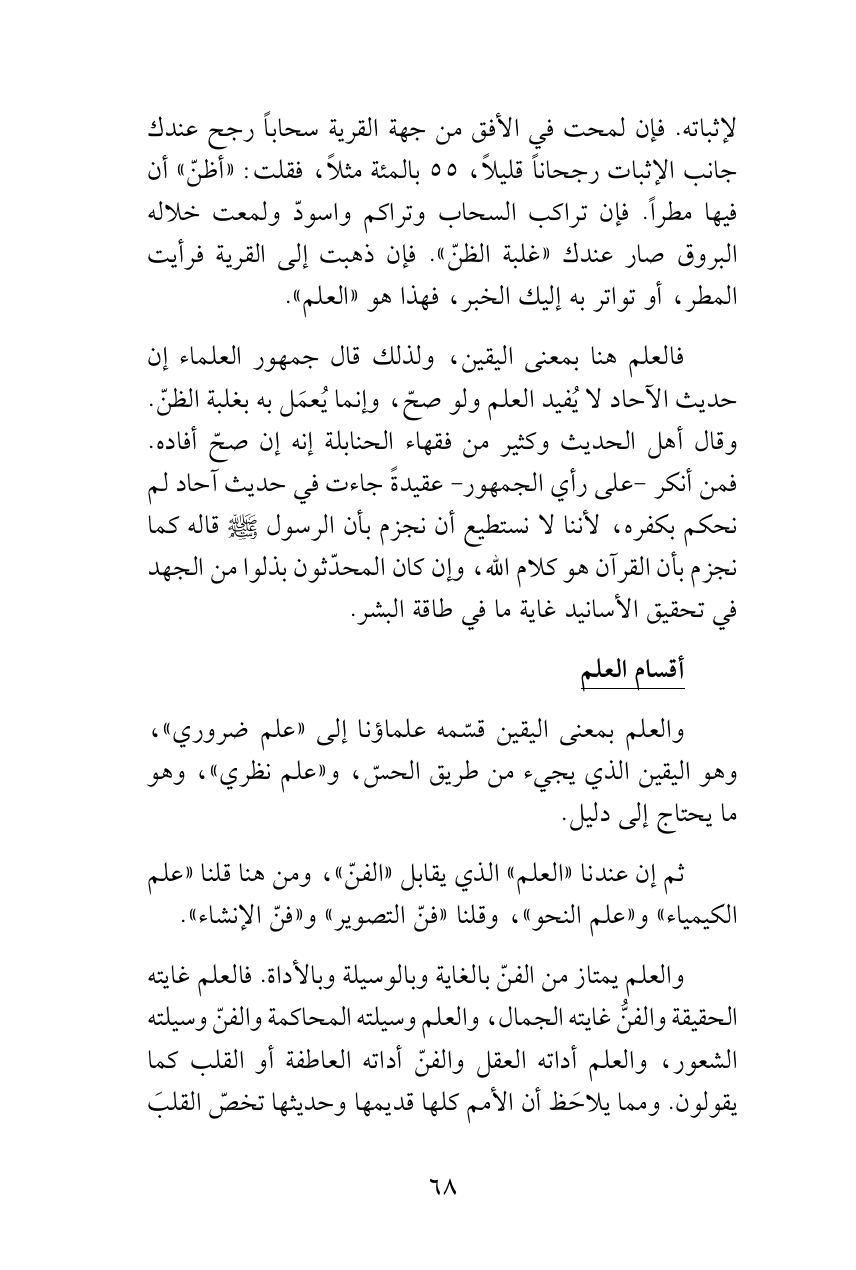 لإثباته. فإن لمحت في الأفق من جهة القرية سحاباً رجح عندك جانب الإثبات رجحاناً قليلاً، 55 بالمئة مثلاً، فقلت: «أظنّ» أن فيها مطراً. فإن تراكب السحاب وتراكم واسودّ ولمعت خلاله البروق صار عندك «غلبة الظنّ». فإن ذهبت إلى القرية فرأيت المطر، أو تواتر به إليك الخبر، فهذا هو «العلم».