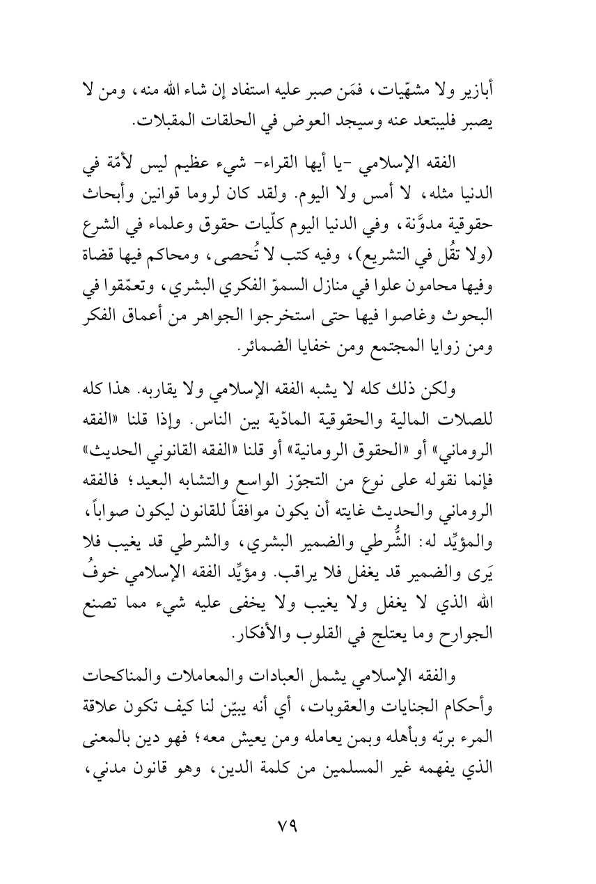 الفقه الإسلامي -يا أيها القراء- شيء عظيم ليس لأمّة في الدنيا مثله، لا أمس ولا اليوم. ولقد كان لروما قوانين وأبحاث حقوقية مدوَّنة، وفي الدنيا اليوم كلّيات حقوق وعلماء في الشرع (ولا تقُل في التشريع)، وفيه كتب لا تُحصى، ومحاكم فيها قضاة وفيها محامون علوا في منازل السموّ الفكري البشري، وتعمّقوا في البحوث وغاصوا فيها حتى استخرجوا الجواهر من أعماق الفكر ومن زوايا المجتمع ومن خفايا الضمائر.