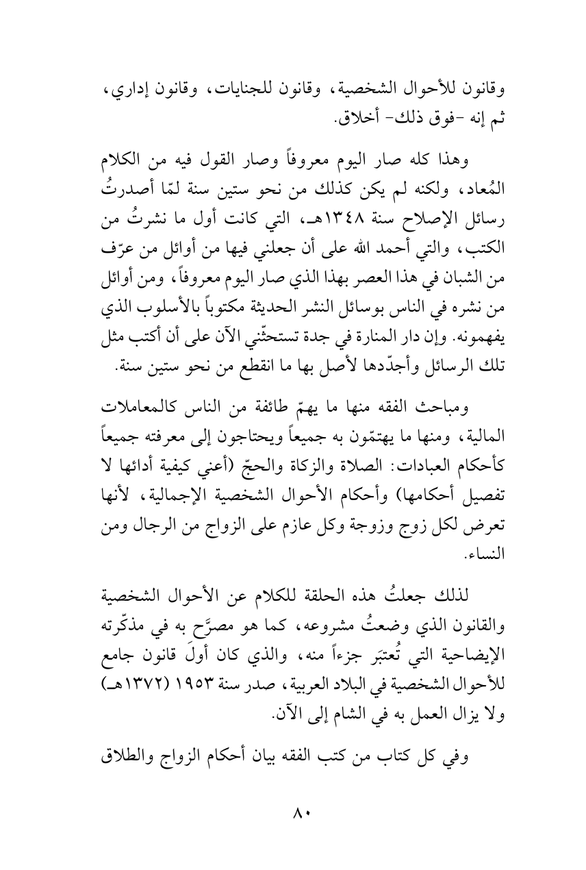لذلك جعلتُ هذه الحلقة للكلام عن الأحوال الشخصية والقانون الذي وضعتُ مشروعه، كما هو مصرَّح به في مذكّرته الإيضاحية التي تُعتبَر جزءاً منه، والذي كان أولَ قانون جامع للأحوال الشخصية في البلاد العربية، صدر سنة 1953 (1372هـ) ولا يزال العمل به في الشام إلى الآن.