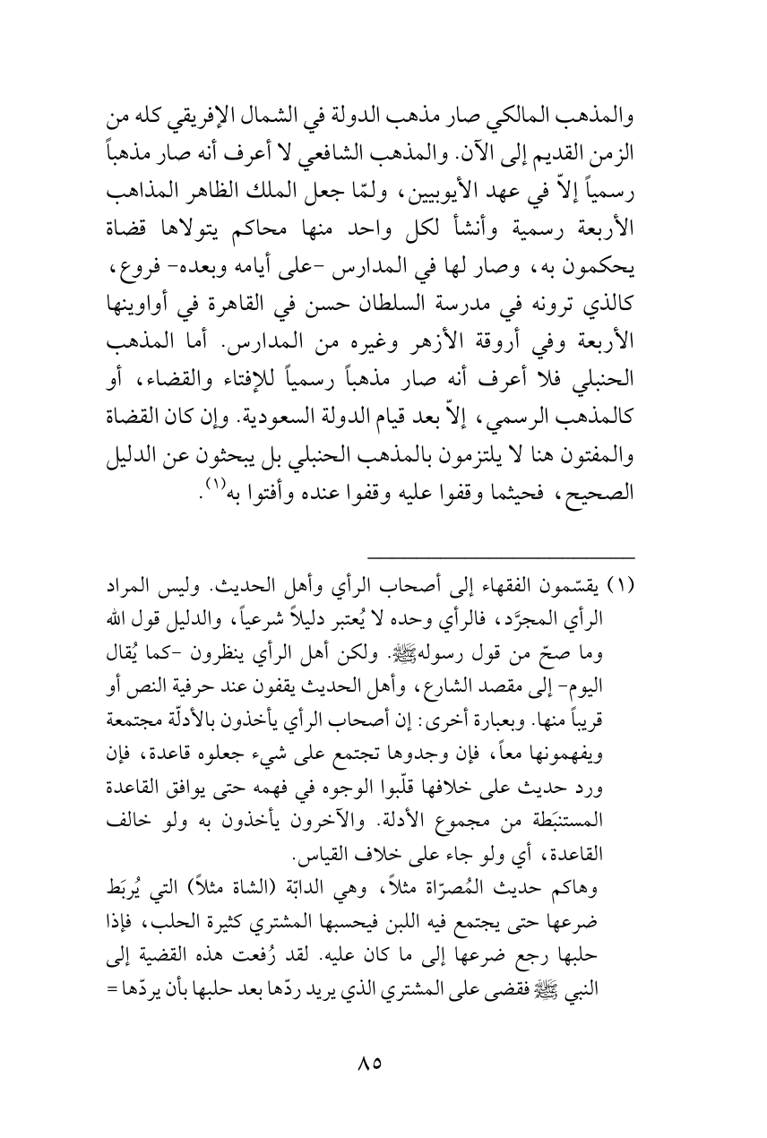 والمذهب المالكي صار مذهب الدولة في الشمال الإفريقي كله من الزمن القديم إلى الآن. والمذهب الشافعي لا أعرف أنه صار مذهباً رسمياً إلاّ في عهد الأيوبيين، ولمّا جعل الملك الظاهر المذاهب الأربعة رسمية وأنشأ لكل واحد منها محاكم يتولاها قضاة يحكمون به، وصار لها في المدارس -على أيامه وبعده- فروع، كالذي ترونه في مدرسة السلطان حسن في القاهرة في أواوينها الأربعة وفي أروقة الأزهر وغيره من المدارس. أما المذهب الحنبلي فلا أعرف أنه صار مذهباً رسمياً للإفتاء والقضاء، أو كالمذهب الرسمي، إلاّ بعد قيام الدولة السعودية. وإن كان القضاة والمفتون هنا لا يلتزمون بالمذهب الحنبلي بل يبحثون عن الدليل الصحيح، فحيثما وقفوا عليه وقفوا عنده وأفتوا به (¬1).
