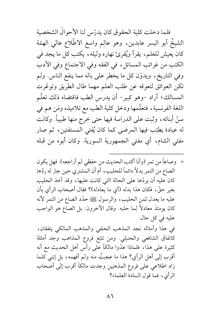 فلما دخلت كلية الحقوق كان يدرّس لنا الأحوالَ الشخصية الشيخُ أبو اليسر عابدين، وهو عالِم واسع الاطّلاع عالي الهمّة كان يعيش للعلم، يقرأ ويُقرئ نهاره وليله، يكتب كل ما يجد في الكتب من غرائب المسائل، في الفقه وفي الاجتماع وفي الأدب وفي التاريخ، ويدوّن كل ما يخطر على باله مما ينفع الناس. ولم تكن العوائق لتعوقه عن طلب العلم مهما طال الطريق وتوعّرت المسالك؛ أراد -وهو كبير- أن يدرس الطب فاقتضاه ذلك تعلّم اللغة الفرنسية، فتعلّمها ودخل كلية الطب مع تلاميذه ومَن هم في سنّ أبنائه، وثبت على الدراسة فيها حتى خرج منها طبيباً. وكانت له عيادة يطبّب فيها المرضى كما كان يُفتي المستفتين، ثم صار مفتي الشام، أي مفتي الجمهورية السورية. وكان أبوه من قبله