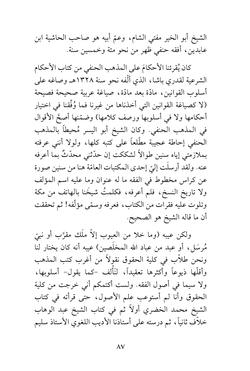 كان يُقرئنا الأحكامَ على المذهب الحنفي من كتاب الأحكام الشرعية لقدري باشا، الذي ألّفه نحو سنة 1328هـ وصاغه على أسلوب القوانين، مادّة بعد مادّة، صياغة عربية صحيحة فصيحة (لا كصياغة القوانين التي أخذناها من غيرنا فما وُفِّقنا في اختيار أحكامها ولا في أسلوبها ورصف كلامها) وضمّنها أصحَّ الأقوال في المذهب الحنفي. وكان الشيخ أبو اليسر مُحيطاً بالمذهب الحنفي إحاطة عجيبة مطّلعاً على كتبه كلها، ولولا أنني عرفته بملازمتي إياه سنين طوالاً لشككت إن حدّثني محدّثٌ بما أعرفه عنه. ولقد أرسلَت إليّ إحدى المكتبات العامّة هنا من سنين صورة عن كراس مخطوط في الفقه ما له عنوان وما عليه اسم المؤلف ولا تاريخ النسخ، فلم أعرفه، فكلمتُ شيخَنا بالهاتف من مكة وتلوت عليه فقرات من الكتاب، فعرفه وسمّى مؤلّفه! ثم تحققت أن ما قاله الشيخ هو الصحيح.