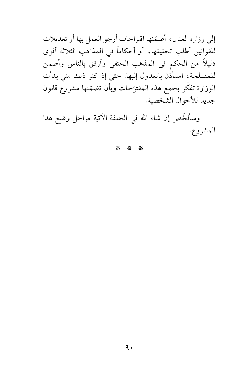 إلى وزارة العدل، أضمّنها اقتراحات أرجو العمل بها أو تعديلات للقوانين أطلب تحقيقها، أو أحكاماً في المذاهب الثلاثة أقوى دليلاً من الحكم في المذهب الحنفي وأرفق بالناس وأضمن للمصلحة، استأذن بالعدول إليها. حتى إذا كثر ذلك مني بدأت الوزارة تفكّر بجمع هذه المقترَحات وبأن تضمّنها مشروع قانون جديد للأحوال الشخصية.