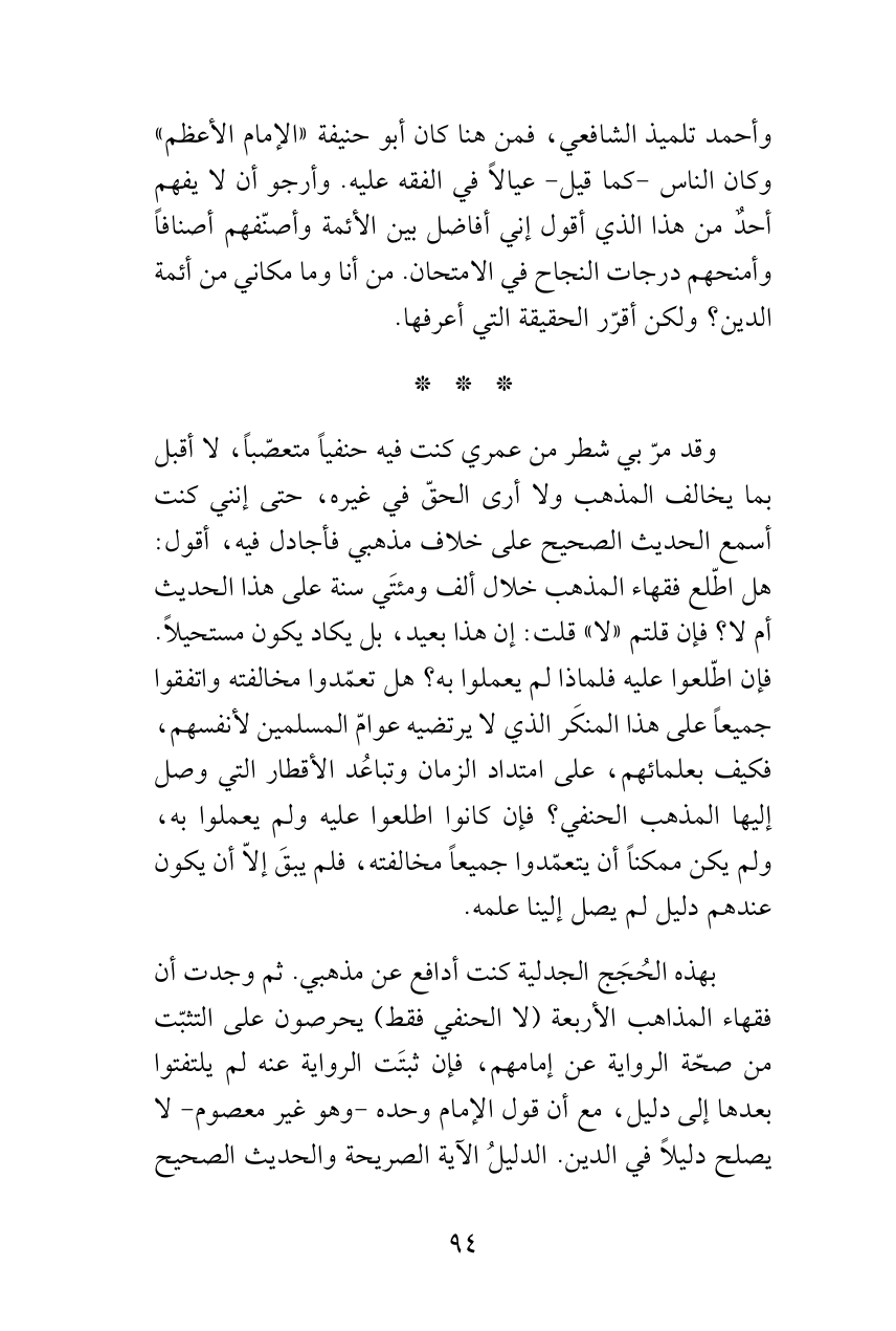 وقد مرّ بي شطر من عمري كنت فيه حنفياً متعصّباً، لا أقبل بما يخالف المذهب ولا أرى الحقّ في غيره، حتى إنني كنت أسمع الحديث الصحيح على خلاف مذهبي فأجادل فيه، أقول: هل اطّلع فقهاء المذهب خلال ألف ومئتَي سنة على هذا الحديث أم لا؟ فإن قلتم «لا» قلت: إن هذا بعيد، بل يكاد يكون مستحيلاً. فإن اطّلعوا عليه فلماذا لم يعملوا به؟ هل تعمّدوا مخالفته واتفقوا جميعاً على هذا المنكَر الذي لا يرتضيه عوامّ المسلمين لأنفسهم، فكيف بعلمائهم، على امتداد الزمان وتباعُد الأقطار التي وصل إليها المذهب الحنفي؟ فإن كانوا اطلعوا عليه ولم يعملوا به، ولم يكن ممكناً أن يتعمّدوا جميعاً مخالفته، فلم يبقَ إلاّ أن يكون عندهم دليل لم يصل إلينا علمه.