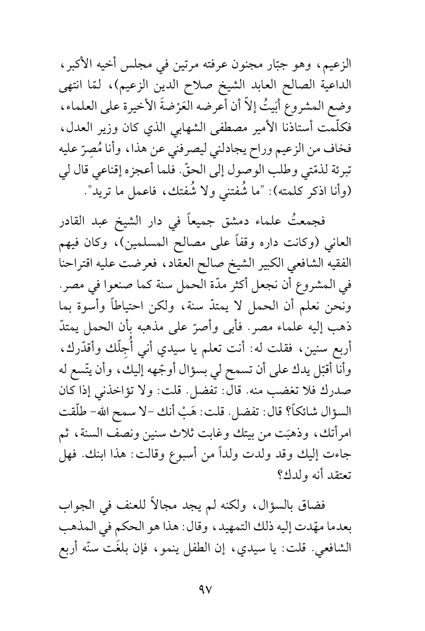 فضاق بالسؤال، ولكنه لم يجد مجالاً للعنف في الجواب بعدما مهّدت إليه ذلك التمهيد، وقال: هذا هو الحكم في المذهب الشافعي. قلت: يا سيدي، إن الطفل ينمو، فإن بلغَت سنّه أربع