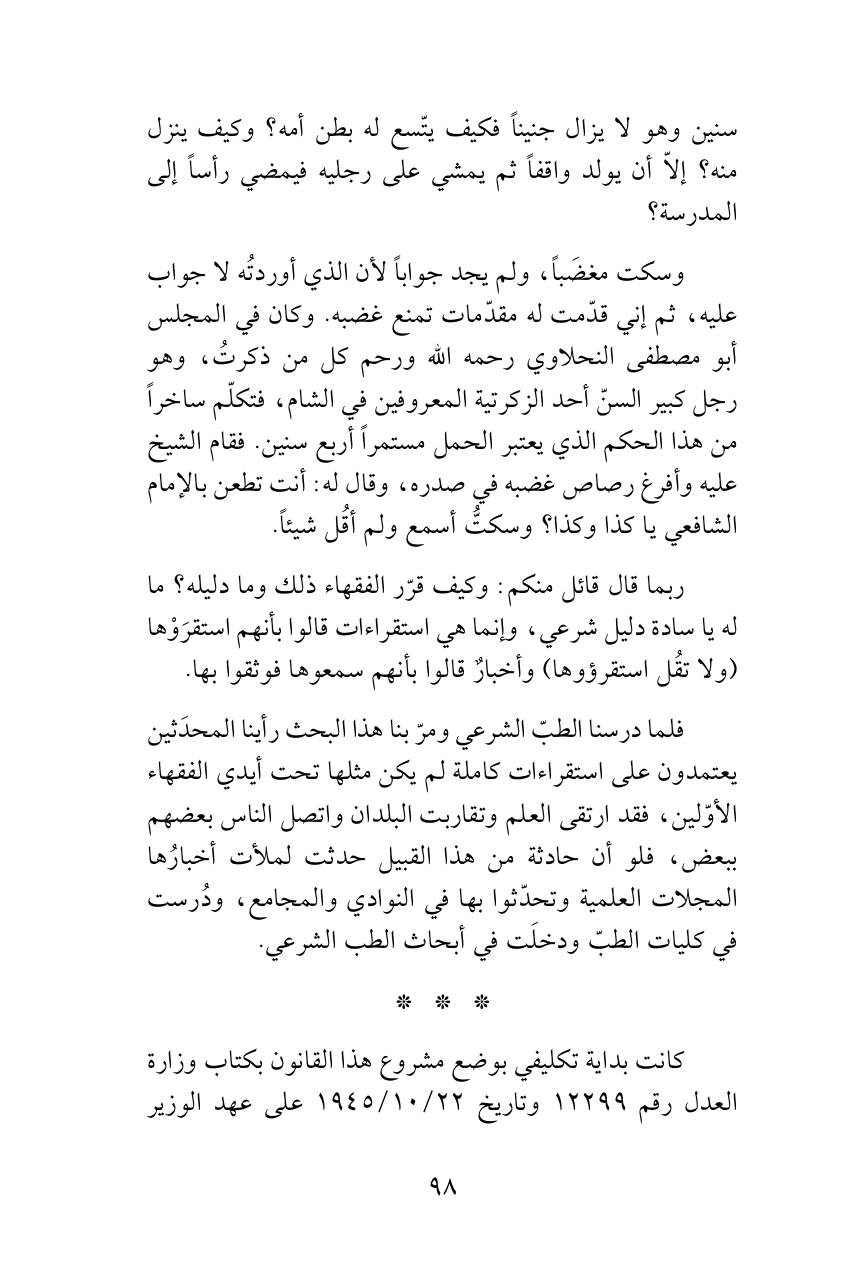 فلما درسنا الطبّ الشرعي ومرّ بنا هذا البحث رأينا المحدَثين يعتمدون على استقراءات كاملة لم يكن مثلها تحت أيدي الفقهاء الأوّلين، فقد ارتقى العلم وتقاربت البلدان واتصل الناس بعضهم ببعض، فلو أن حادثة من هذا القبيل حدثت لملأت أخبارُها المجلات العلمية وتحدّثوا بها في النوادي والمجامع، ودُرست في كليات الطبّ ودخلَت في أبحاث الطب الشرعي.