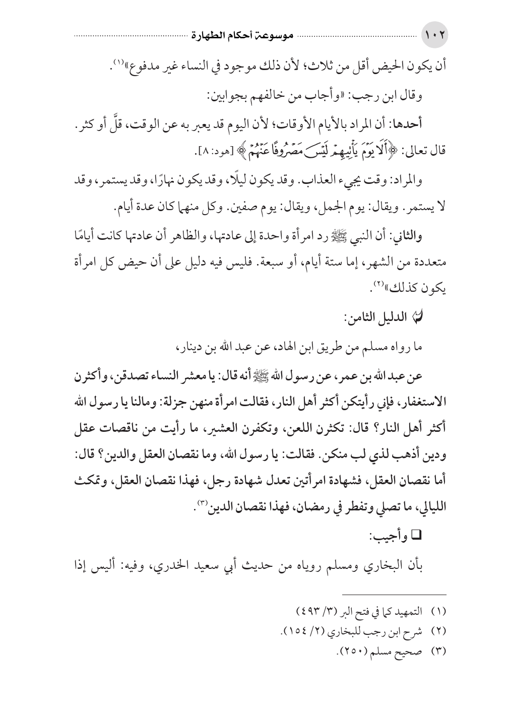 والثاني: أن النبي صلى الله عليه وسلم رد امرأة واحدة إلى عادتها، والظاهر أن عادتها كانت أيامًا متعددة من الشهر، إما ستة أيام، أو سبعة. فليس فيه دليل على أن حيض كل امرأة يكون كذلك» (¬٢).