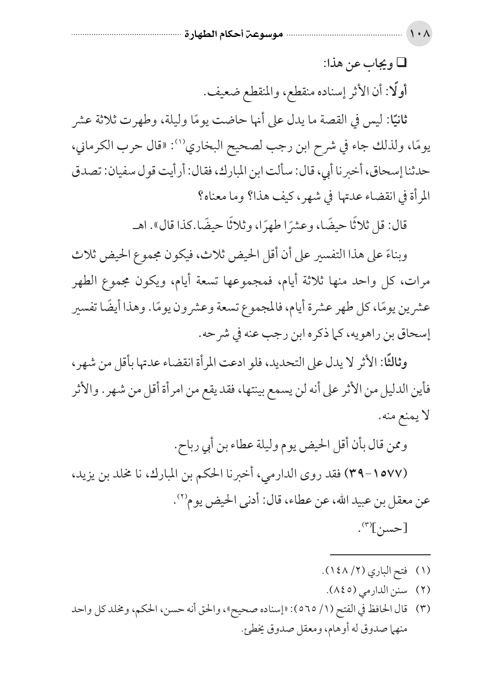 (١٥٧٧ - ٣٩) فقد روى الدارمي، أخبرنا الحكم بن المبارك، نا مخلد بن يزيد، عن معقل بن عبيد الله، عن عطاء، قال: أدنى الحيض يوم (¬٢).
