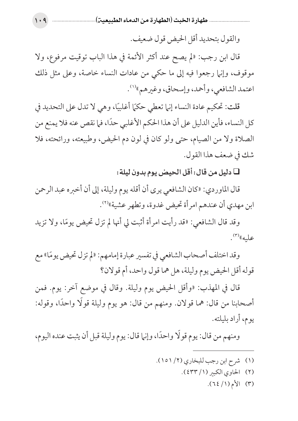 قال ابن رجب: «لم يصح عند أكثر الأئمة في هذا الباب توقيت مرفوع، ولا موقوف، وإنما رجعوا فيه إلى ما حكي من عادات النساء خاصة، وعلى مثل ذلك اعتمد الشافعي، وأحمد، وإسحاق، وغيرهم» (¬١).