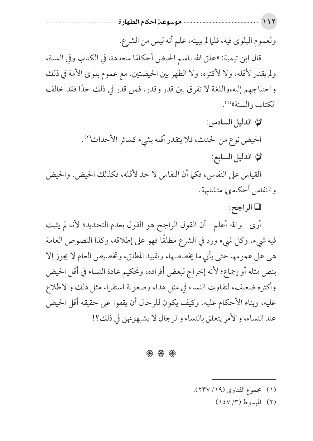 قال ابن تيمية: «علق الله باسم الحيض أحكامًا متعددة، في الكتاب وفي السنة، ولم يقدر لأقله، ولا لأكثره، ولا الطهر بين الحيضتين. مع عموم بلوى الأمة في ذلك واحتياجهم إليه، واللغة لا تفرق بين قدر وقدر، فمن قدر في ذلك حدًا فقد خالف الكتاب والسنة» (¬١).