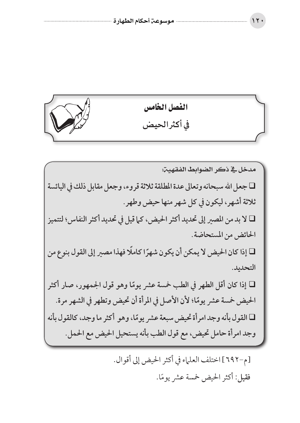 - إذا كان أقل الطهر في الطب خمسة عشر يومًا وهو قول الجمهور، صار أكثر الحيض خمسة عشر يومًا؛ لأن الأصل في المرأة أن تحيض وتطهر في الشهر مرة.