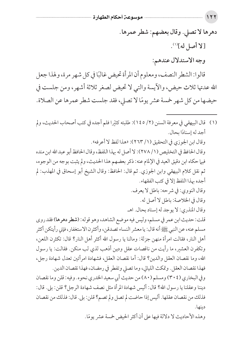 قلت: حديث ابن عمر في مسلم، وليس فيه موضع الشاهد، وهو قوله: (شطر دهرها) فقد روى مسلم عنه، عن النبي صلى الله عليه وسلم أنه قال: يا معشر النساء تصدقن، وأكثرن الاستغفار، فإني رأيتكن أكثر أهل النار، فقالت امرأة منهن جزلة: ومالنا يا رسول الله أكثر أهل النار؟ قال: تكثرن اللعن، وتكفرن العشير، ما رأيت من ناقصات عقل ودين أذهب لذي لب منكن. فقالت: يا رسول الله، وما نقصان العقل والدين؟ قال: أما نقصان العقل، فشهادة امرأتين تعدل شهادة رجل، فهذا نقصان العقل. وتمكث الليالي، وما تصلي وتفطر في رمضان، فهذا نقصان الدين.