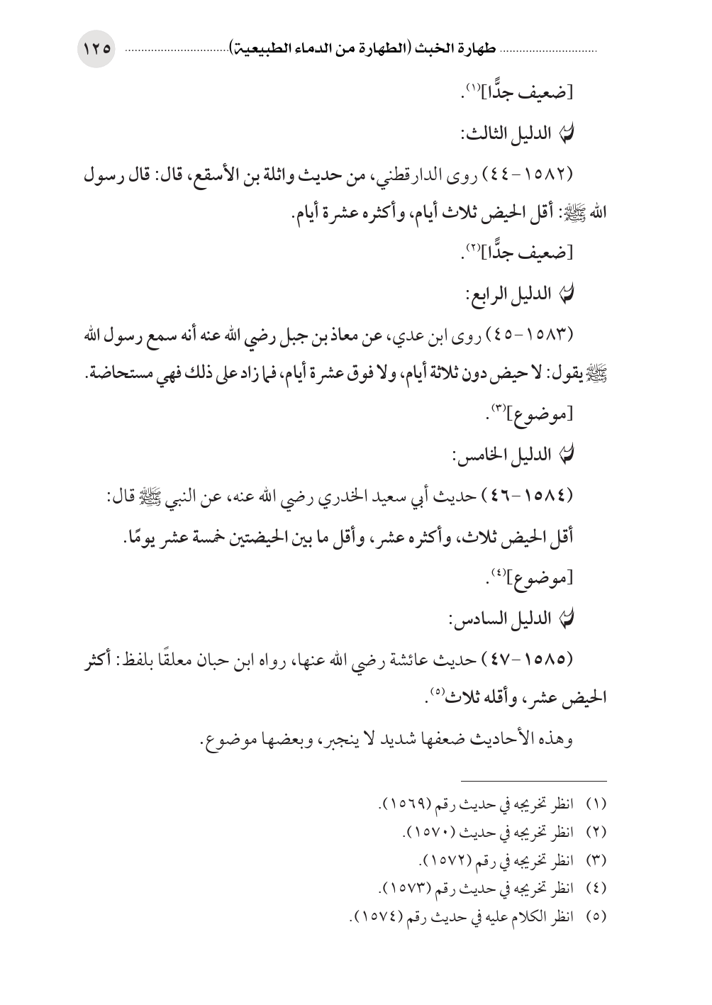 (١٥٨٢ - ٤٤) روى الدارقطني، من حديث واثلة بن الأسقع، قال: قال رسول الله صلى الله عليه وسلم: أقل الحيض ثلاث أيام، وأكثره عشرة أيام.