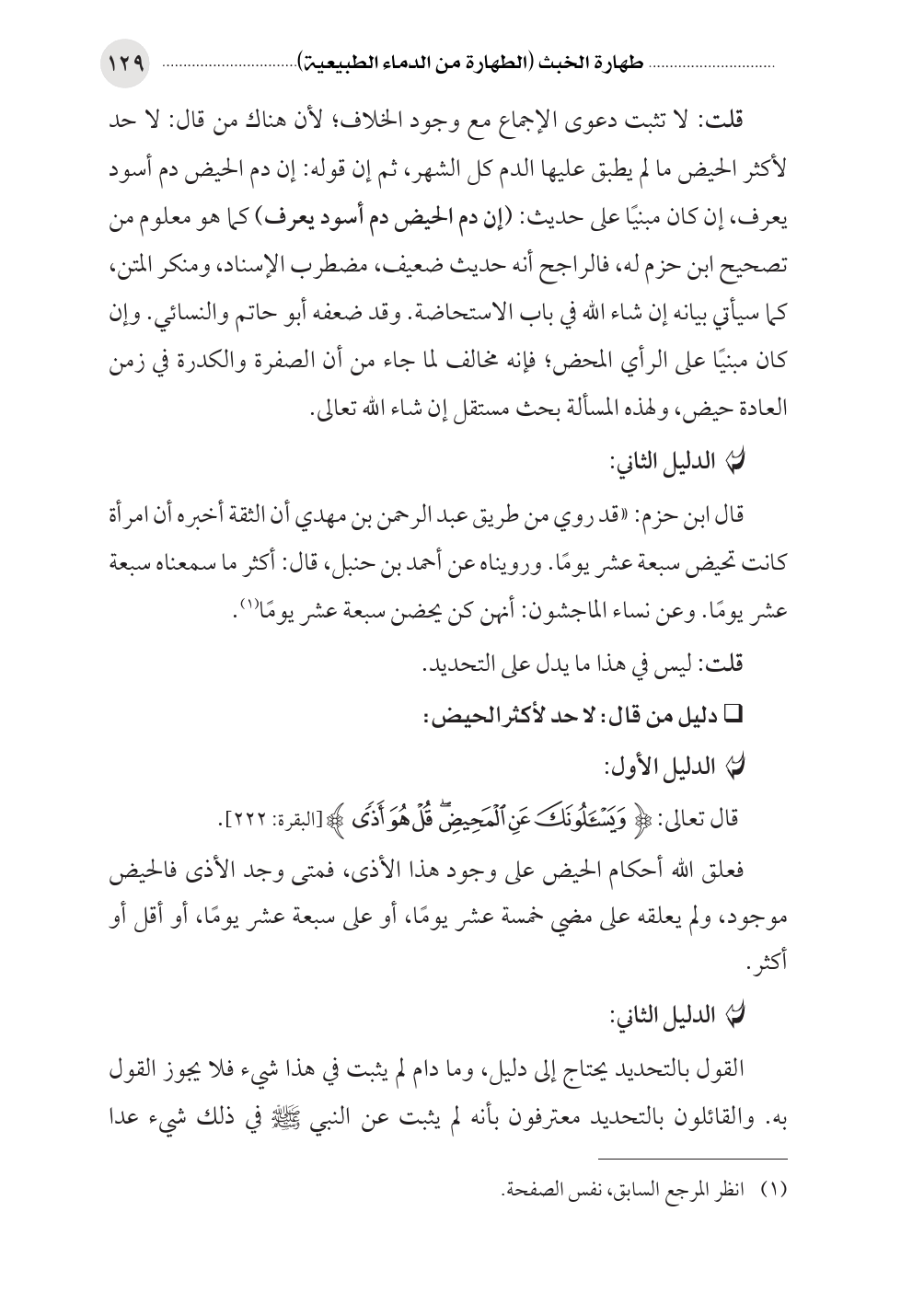 قلت: لا تثبت دعوى الإجماع مع وجود الخلاف؛ لأن هناك من قال: لا حد لأكثر الحيض ما لم يطبق عليها الدم كل الشهر، ثم إن قوله: إن دم الحيض دم أسود يعرف، إن كان مبنيًا على حديث: (إن دم الحيض دم أسود يعرف) كما هو معلوم من تصحيح ابن حزم له، فالراجح أنه حديث ضعيف، مضطرب الإسناد، ومنكر المتن، كما سيأتي بيانه إن شاء الله في باب الاستحاضة. وقد ضعفه أبو حاتم والنسائي. وإن كان مبنيًا على الرأي المحض؛ فإنه مخالف لما جاء من أن الصفرة والكدرة في زمن العادة حيض، ولهذه المسألة بحث مستقل إن شاء الله تعالى.