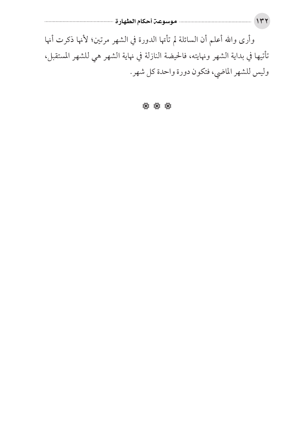 وأرى والله أعلم أن السائلة لم تأتها الدورة في الشهر مرتين؛ لأنها ذكرت أنها تأتيها في بداية الشهر ونهايته، فالحيضة النازلة في نهاية الشهر هي للشهر المستقبل، وليس للشهر الماضي، فتكون دورة واحدة كل شهر.