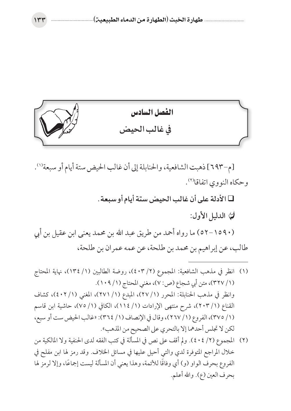 (¬١) انظر في مذهب الشافعية: المجموع (٢/ ٤٠٣)، روضة الطالبين (١/ ١٣٤)، نهاية المحتاج (١/ ٣٢٧)، متن أبي شجاع (ص: ٧)، مغني المحتاج (١/ ١٠٩)، وانظر في مذهب الحنابلة: المحرر (١/ ٢٧)، المبدع (١/ ٢٧١)، المغني (١/ ٤٠٢)، كشاف القناع (١/ ٢٠٣)، شرح منتهى الإرادات (١/ ١١٤)، الكافي (١/ ٧٥)، حاشية ابن قاسم (١/ ٣٧٥)، الفروع (١/ ٢٦٧)، وقال في الإنصاف (١/ ٣٦٤): «غالب الحيض ست أو سبع، لكن لا تجلس أحدهما إلا بالتحري على الصحيح من المذهب».