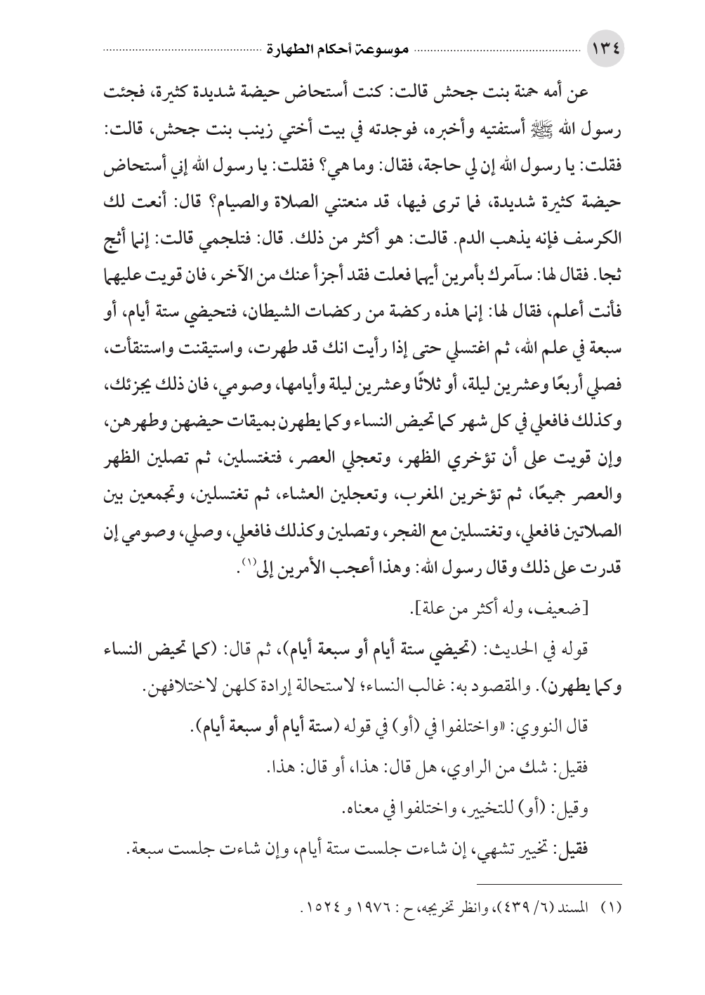 عن أمه حمنة بنت جحش قالت: كنت أستحاض حيضة شديدة كثيرة، فجئت رسول الله صلى الله عليه وسلم أستفتيه وأخبره، فوجدته في بيت أختي زينب بنت جحش، قالت: فقلت: يا رسول الله إن لي حاجة، فقال: وما هي؟ فقلت: يا رسول الله إني أستحاض حيضة كثيرة شديدة، فما ترى فيها، قد منعتني الصلاة والصيام؟ قال: أنعت لك الكرسف فإنه يذهب الدم. قالت: هو أكثر من ذلك. قال: فتلجمي قالت: إنما أثج ثجا. فقال لها: سآمرك بأمرين أيهما فعلت فقد أجزأ عنك من الآخر، فان قويت عليهما فأنت أعلم، فقال لها: إنما هذه ركضة من ركضات الشيطان، فتحيضي ستة أيام، أو سبعة في علم الله، ثم اغتسلي حتى إذا رأيت انك قد طهرت، واستيقنت واستنقأت، فصلي أربعًا وعشرين ليلة، أو ثلاثًا وعشرين ليلة وأيامها، وصومي، فان ذلك يجزئك، وكذلك فافعلي في كل شهر كما تحيض النساء وكما يطهرن بميقات حيضهن وطهرهن، وإن قويت على أن تؤخري الظهر، وتعجلي العصر، فتغتسلين، ثم تصلين الظهر والعصر جميعًا، ثم تؤخرين المغرب، وتعجلين العشاء، ثم تغتسلين، وتجمعين بين الصلاتين فافعلي، وتغتسلين مع الفجر، وتصلين وكذلك فافعلي، وصلي، وصومي إن قدرت على ذلك وقال رسول الله: وهذا أعجب الأمرين إلى (¬١).