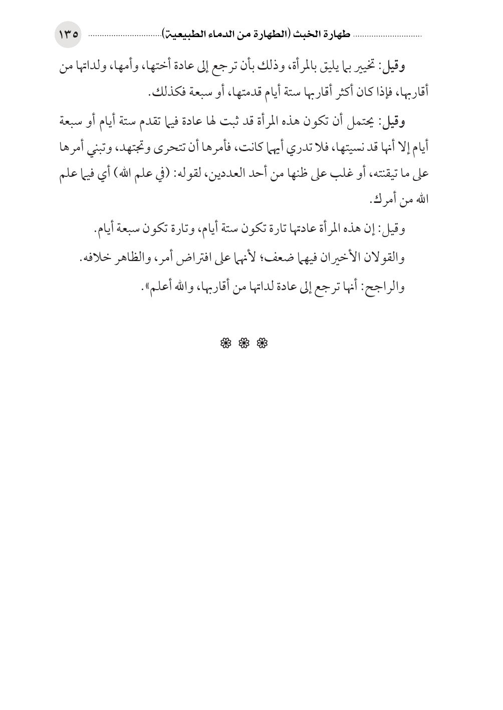 وقيل: تخيير بما يليق بالمرأة، وذلك بأن ترجع إلى عادة أختها، وأمها، ولداتها من أقاربها، فإذا كان أكثر أقاربها ستة أيام قدمتها، أو سبعة فكذلك.