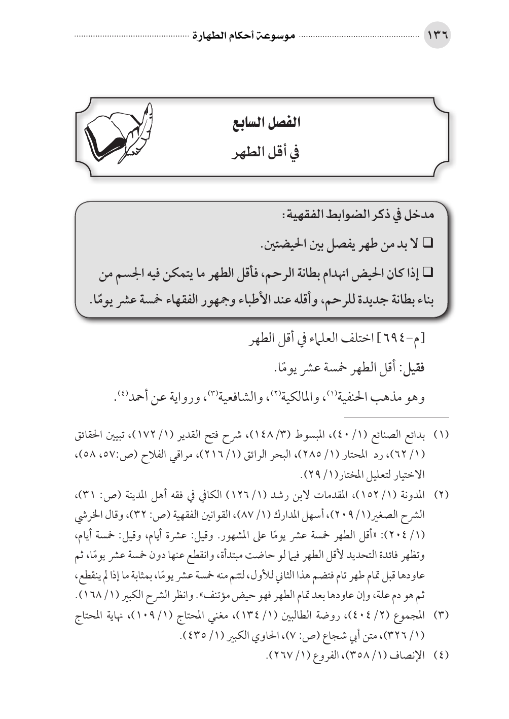 (¬٢) المدونة (١/ ١٥٢)، المقدمات لابن رشد (١/ ١٢٦) الكافي في فقه أهل المدينة (ص: ٣١)، الشرح الصغير (١/ ٢٠٩)، أسهل المدارك (١/ ٨٧)، القوانين الفقهية (ص: ٣٢)، وقال الخرشي (١/ ٢٠٤): «أقل الطهر خمسة عشر يومًا على المشهور. وقيل: عشرة أيام، وقيل: خمسة أيام، وتظهر فائدة التحديد لأقل الطهر فيما لو حاضت مبتدأة، وانقطع عنها دون خمسة عشر يومًا، ثم عاودها قبل تمام طهر تام فتضم هذا الثاني للأول، لتتم منه خمسة عشر يومًا، بمثابة ما إذا لم ينقطع، ثم هو دم علة، وإن عاودها بعد تمام الطهر فهو حيض مؤتنف». وانظر الشرح الكبير (١/ ١٦٨).