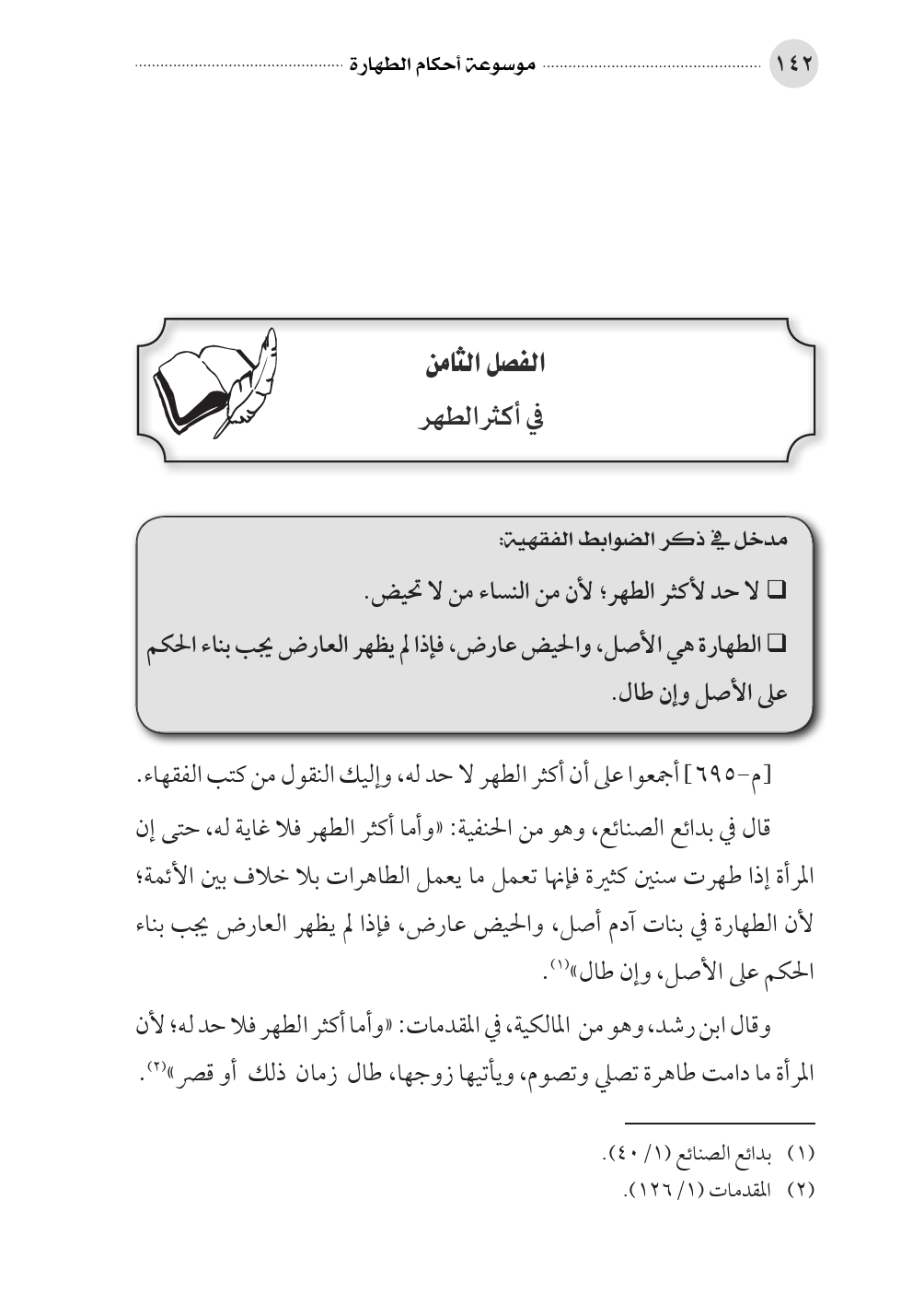 قال في بدائع الصنائع، وهو من الحنفية: «وأما أكثر الطهر فلا غاية له، حتى إن المرأة إذا طهرت سنين كثيرة فإنها تعمل ما يعمل الطاهرات بلا خلاف بين الأئمة؛ لأن الطهارة في بنات آدم أصل، والحيض عارض، فإذا لم يظهر العارض يجب بناء الحكم على الأصل، وإن طال» (¬١).