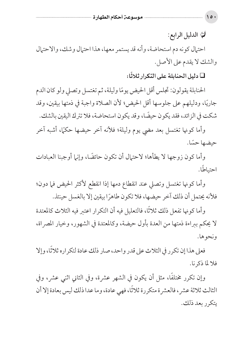 الحنابلة يقولون: تجلس أقل الحيض يومًا وليلة، ثم تغتسل وتصلي ولو كان الدم جاريًا، ودليلهم على جلوسها أقل الحيض؛ لأن الصلاة واجبة في ذمتها بيقين، وقد شكت في الزائد، فقد يكون حيضًا، وقد يكون استحاضة، فلا تترك اليقين بالشك.