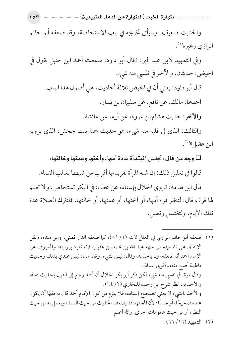 وفي التمهيد لابن عبد البر: «قال أبو داود: سمعت أحمد ابن حنبل يقول في الحيض: حديثان، والآخر في نفسي منه شيء.