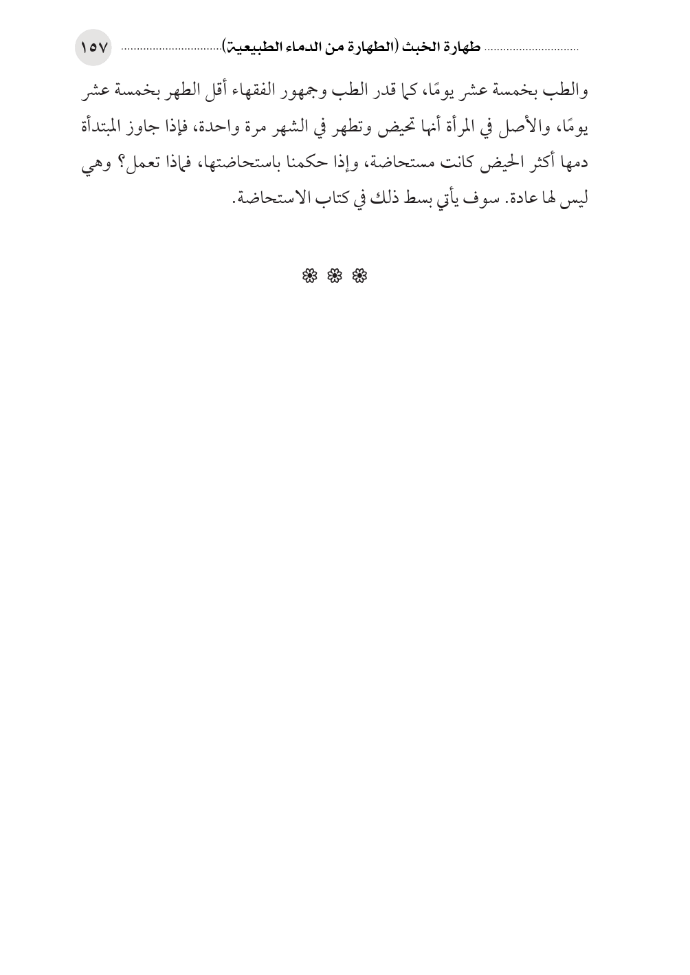 والطب بخمسة عشر يومًا، كما قدر الطب وجمهور الفقهاء أقل الطهر بخمسة عشر يومًا، والأصل في المرأة أنها تحيض وتطهر في الشهر مرة واحدة، فإذا جاوز المبتدأة دمها أكثر الحيض كانت مستحاضة، وإذا حكمنا باستحاضتها، فماذا تعمل؟ وهي ليس لها عادة. سوف يأتي بسط ذلك في كتاب الاستحاضة.