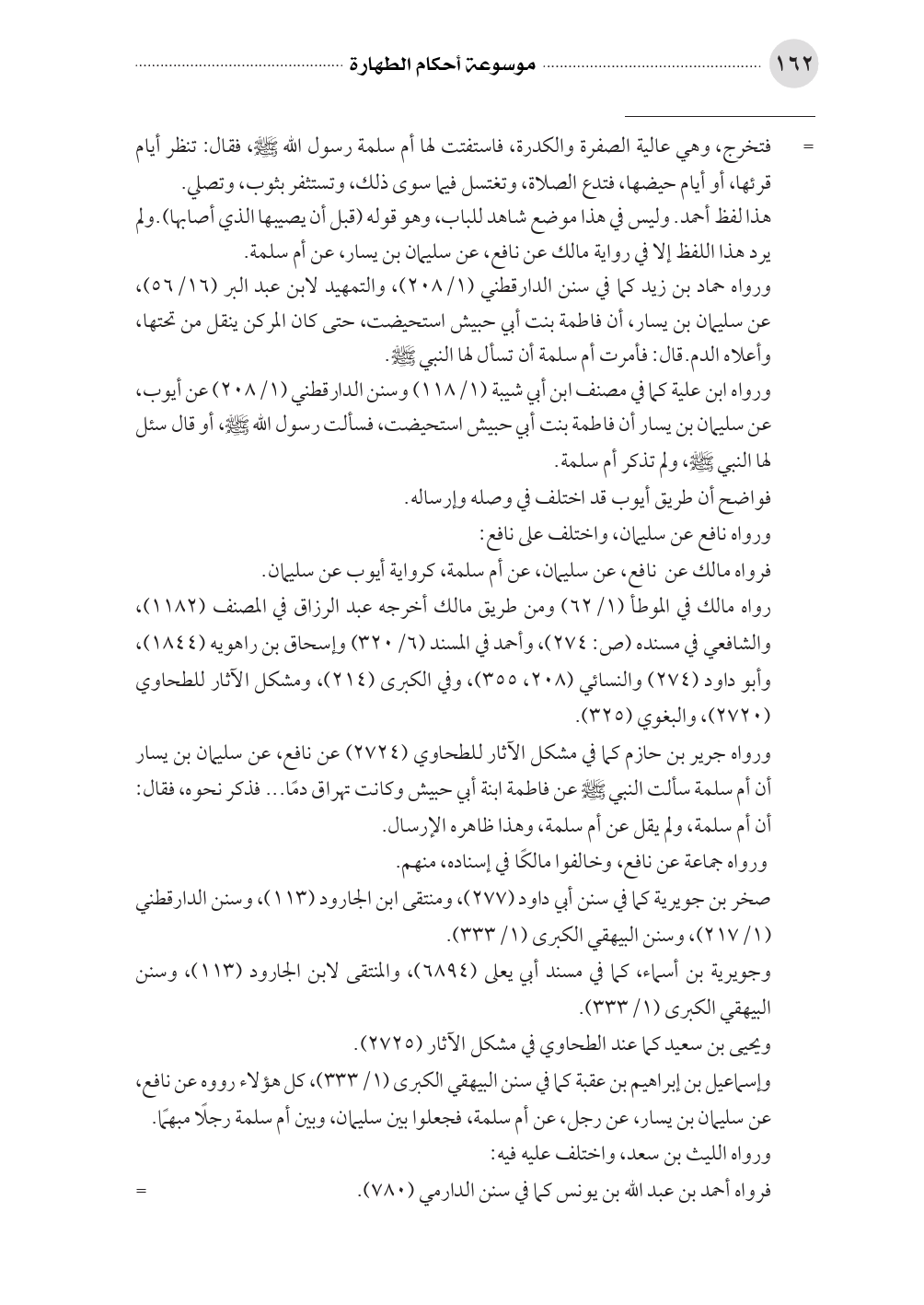 ورواه جرير بن حازم كما في مشكل الآثار للطحاوي (٢٧٢٤) عن نافع، عن سليمان بن يسار أن أم سلمة سألت النبي صلى الله عليه وسلم عن فاطمة ابنة أبي حبيش وكانت تهراق دمًا ... فذكر نحوه، فقال: أن أم سلمة، ولم يقل عن أم سلمة، وهذا ظاهره الإرسال.