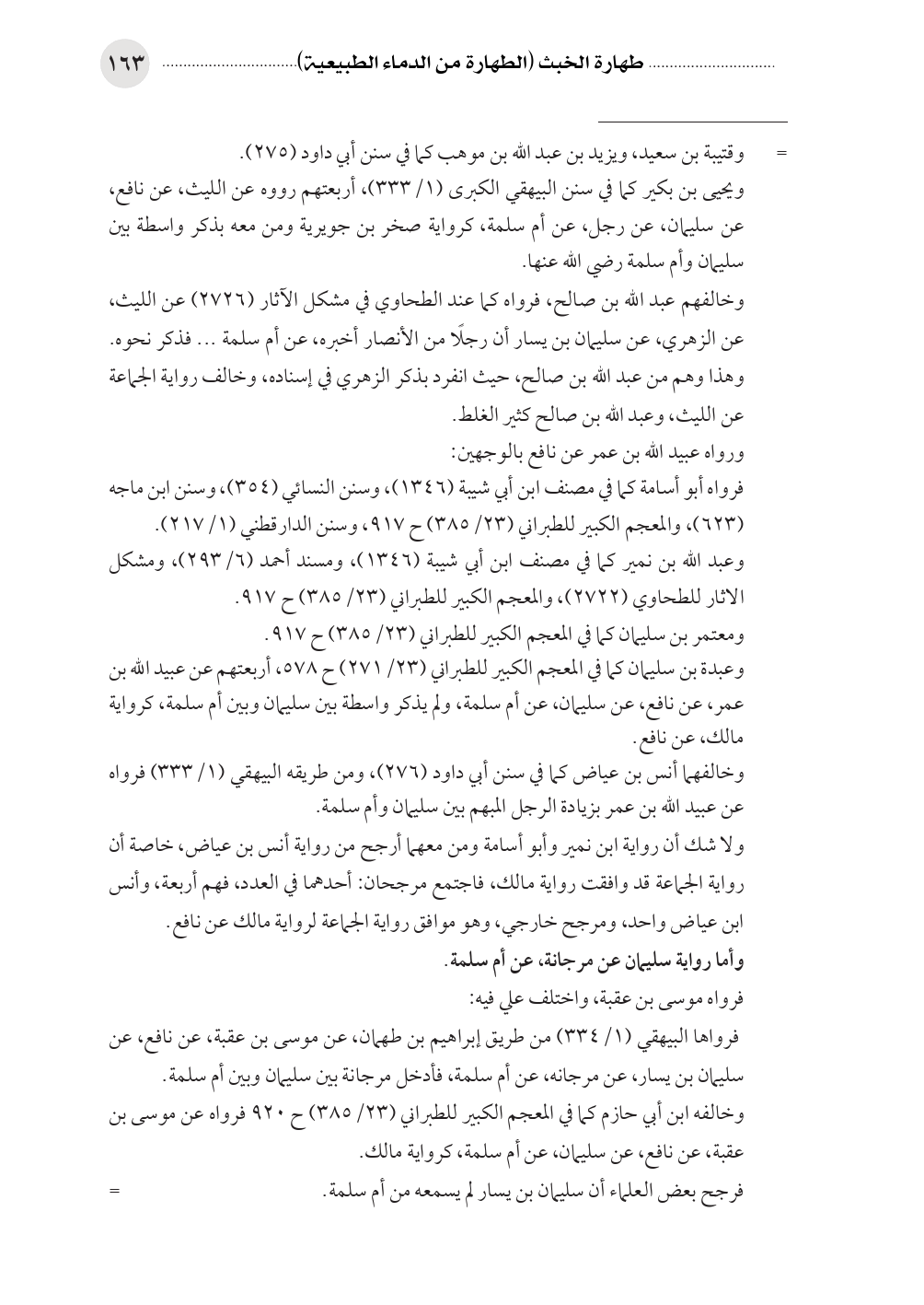 ويحيى بن بكير كما في سنن البيهقي الكبرى (١/ ٣٣٣)، أربعتهم رووه عن الليث، عن نافع، عن سليمان، عن رجل، عن أم سلمة، كرواية صخر بن جويرية ومن معه بذكر واسطة بين سليمان وأم سلمة رضي الله عنها.