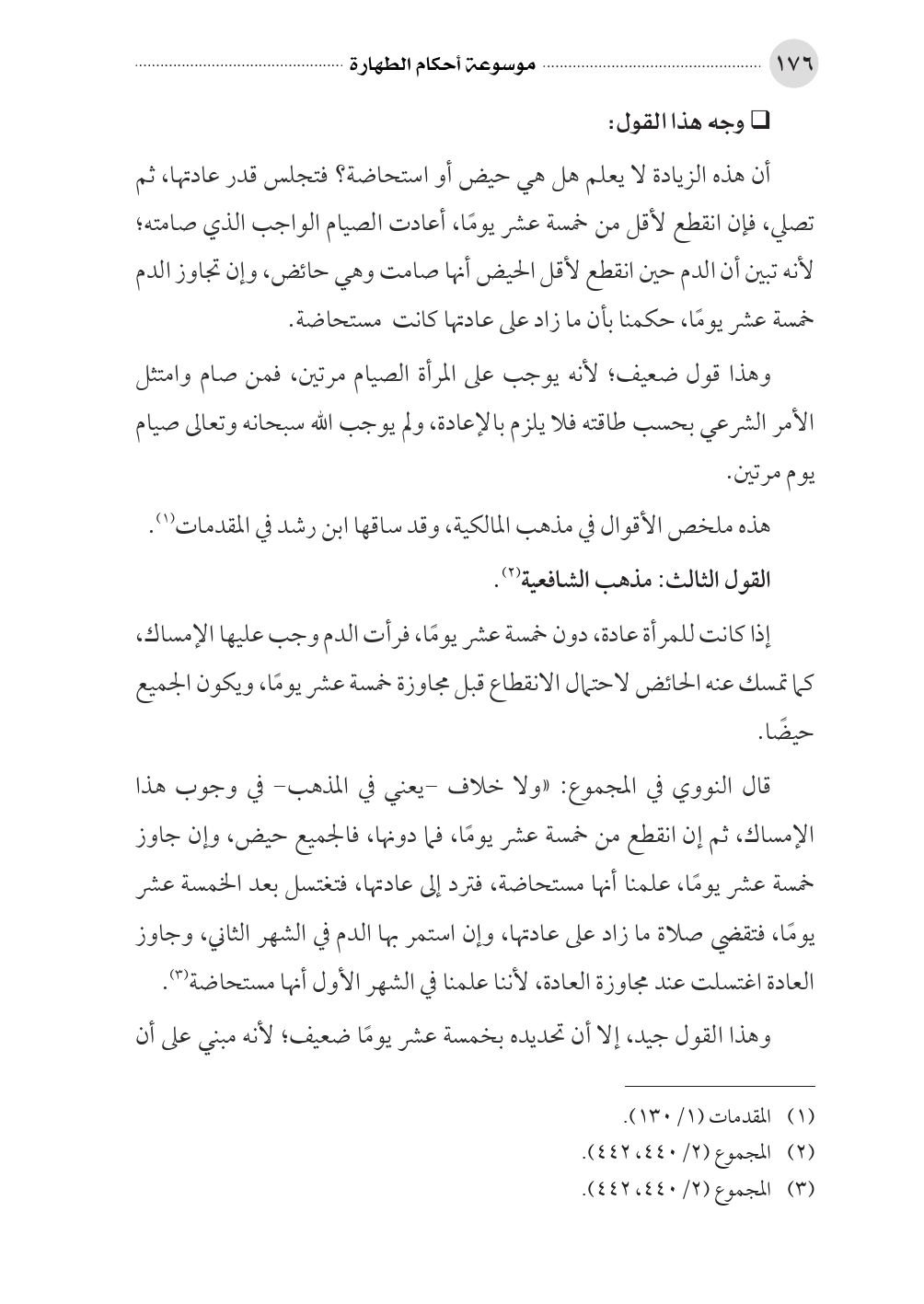 قال النووي في المجموع: «ولا خلاف -يعني في المذهب- في وجوب هذا الإمساك، ثم إن انقطع من خمسة عشر يومًا، فما دونها، فالجميع حيض، وإن جاوز خمسة عشر يومًا، علمنا أنها مستحاضة، فترد إلى عادتها، فتغتسل بعد الخمسة عشر يومًا، فتقضي صلاة ما زاد على عادتها، وإن استمر بها الدم في الشهر الثاني، وجاوز العادة اغتسلت عند مجاوزة العادة، لأننا علمنا في الشهر الأول أنها مستحاضة (¬٣).