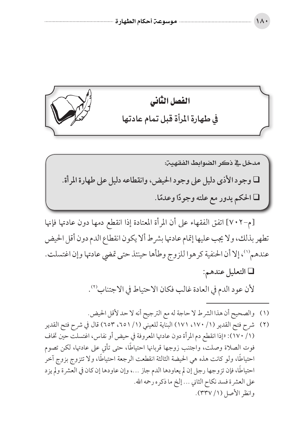 (¬٢) شرح فتح القدير (١/ ١٧٠، ١٧١) البناية للعيني (١/ ٦٥١، ٦٥٣) قال في شرح فتح القدير (١/ ١٧٠): «إذا انقطع دم المرأة دون عادتها المعروفة في حيض أو نفاس، اغتسلت حين تخاف فوت الصلاة وصلت، واجتنب زوجها قربانها احتياطًا، حتى تأتي على عادتها، لكن تصوم احتياطًا، ولو كانت هذه هي الحيضة الثالثة انقطعت الرجعة احتياطًا، ولا تتزوج بزوج آخر احتياطًا، فإن تزوجها رجل إن لم يعاودها الدم جاز ... ، وإن عاودها إن كان في العشرة ولم يزد على العشرة فسد نكاح الثاني ... إلخ ما ذكره رحمه الله، وانظر الأصل (١/ ٣٣٧).