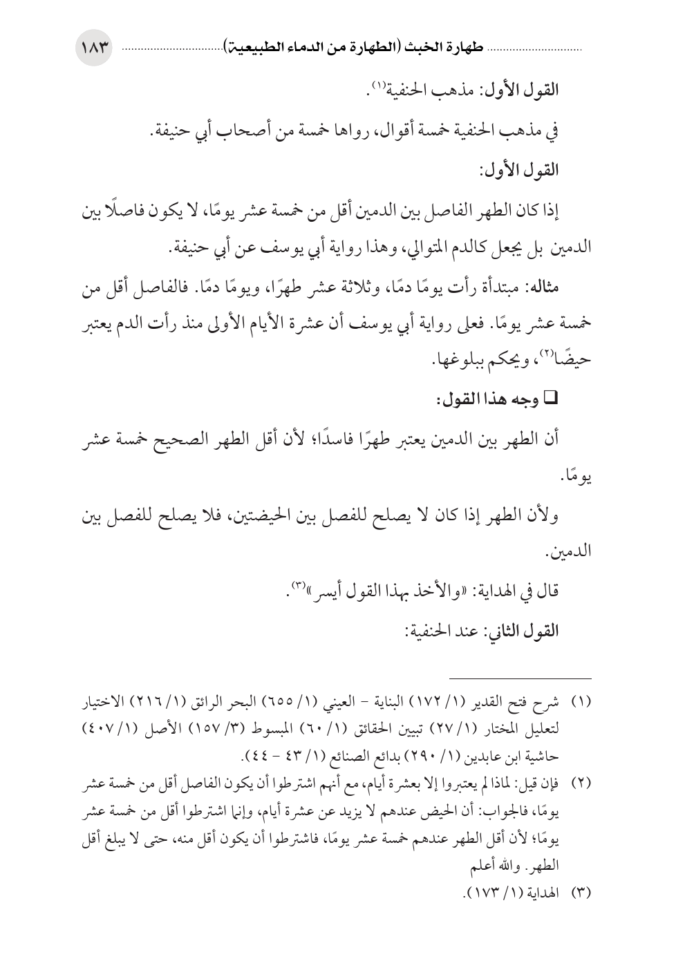 (¬٢) فإن قيل: لماذا لم يعتبروا إلا بعشرة أيام، مع أنهم اشترطوا أن يكون الفاصل أقل من خمسة عشر يومًا، فالجواب: أن الحيض عندهم لا يزيد عن عشرة أيام، وإنما اشترطوا أقل من خمسة عشر يومًا؛ لأن أقل الطهر عندهم خمسة عشر يومًا، فاشترطوا أن يكون أقل منه، حتى لا يبلغ أقل الطهر. والله أعلم