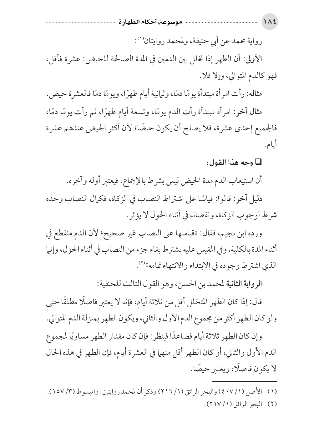 ورده ابن نجيم، فقال: «قياسها على النصاب غير صحيح؛ لأن الدم منقطع في أثناء المدة بالكلية، وفي المقيس عليه يشترط بقاء جزء من النصاب في أثناء الحول، وإنما الذي اشترط وجوده في الابتداء والانتهاء تمامه» (¬٢).