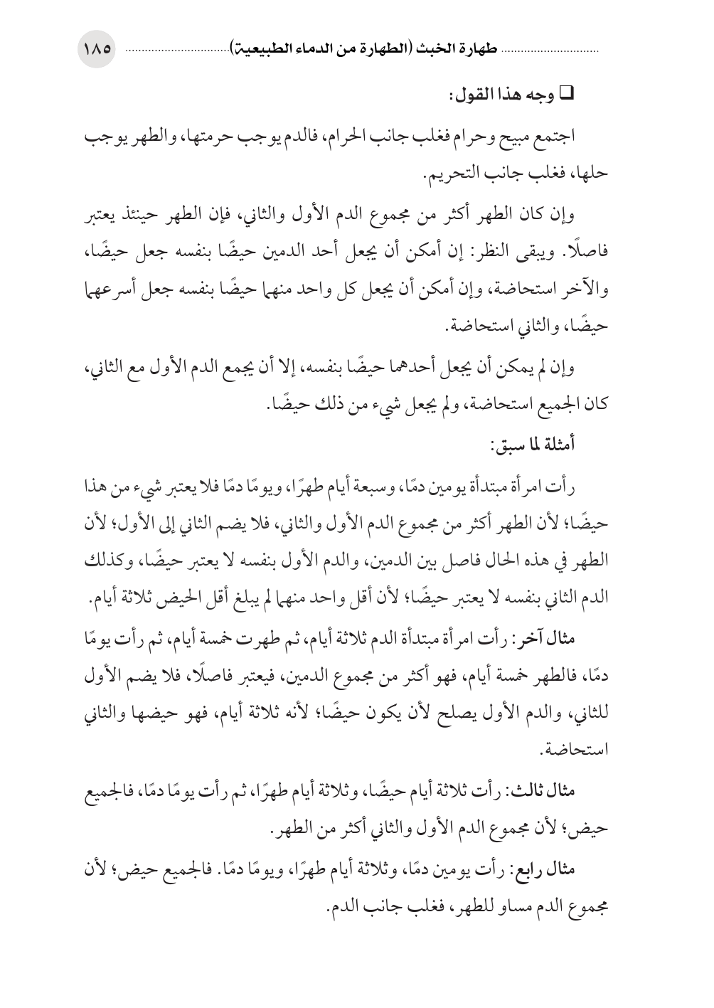 مثال رابع: رأت يومين دمًا، وثلاثة أيام طهرًا، ويومًا دمًا. فالجميع حيض؛ لأن مجموع الدم مساو للطهر، فغلب جانب الدم.