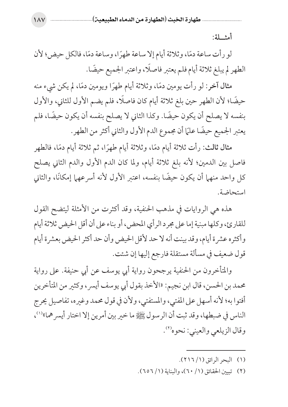 هذه هي الروايات في مذهب الحنفية، وقد أكثرت من الأمثلة ليتضح القول للقارئ، وكلها مبنية إما على مجرد الرأي المحض، أو بناء على أن أقل الحيض ثلاثة أيام وأكثره عشرة أيام، وقد بينت أنه لا حد لأقل الحيض وأن حد أكثر الحيض بعشرة أيام قول ضعيف في مسألة مستقلة فارجع إليها إن شئت.