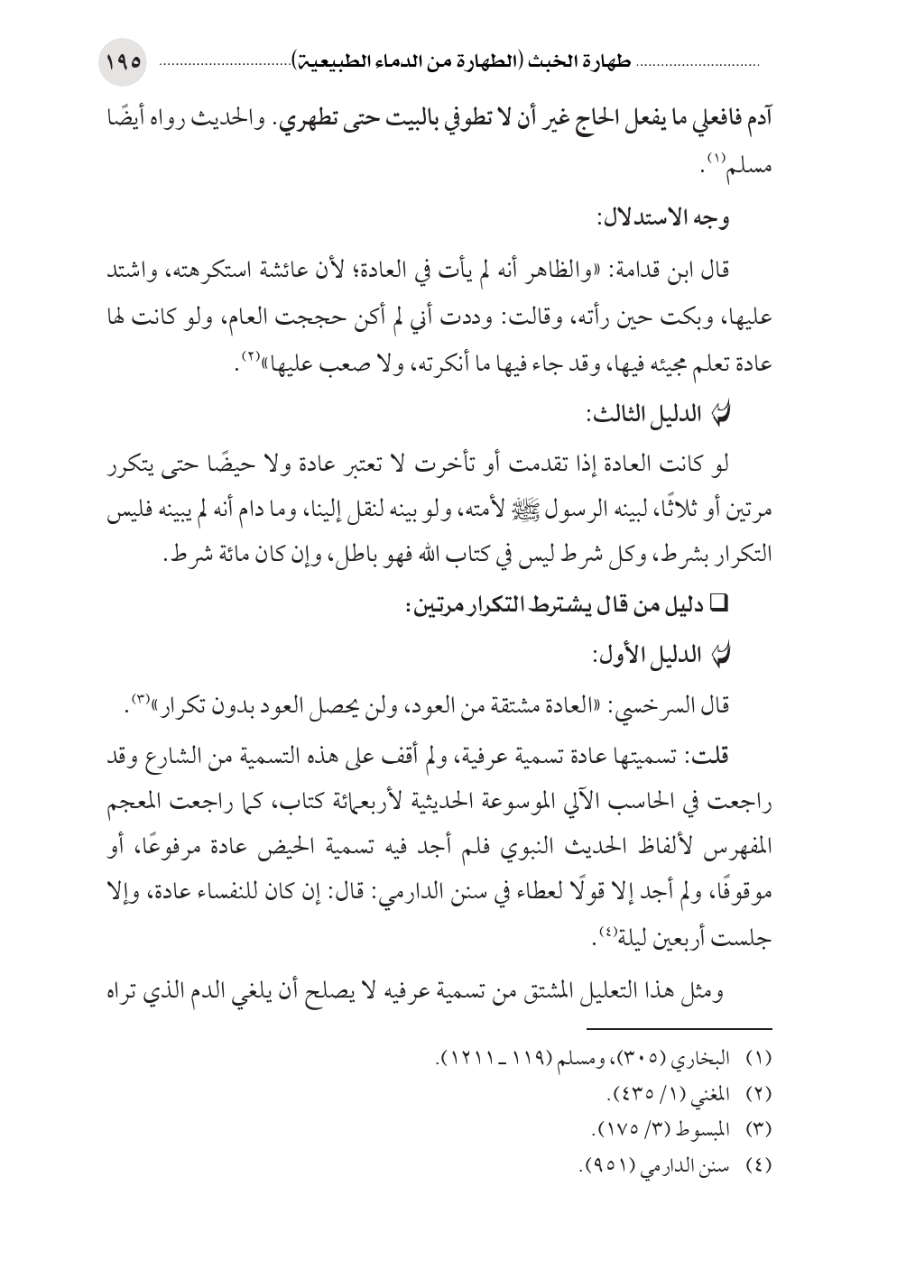 لو كانت العادة إذا تقدمت أو تأخرت لا تعتبر عادة ولا حيضًا حتى يتكرر مرتين أو ثلاثًا، لبينه الرسول صلى الله عليه وسلم لأمته، ولو بينه لنقل إلينا، وما دام أنه لم يبينه فليس التكرار بشرط، وكل شرط ليس في كتاب الله فهو باطل، وإن كان مائة شرط.