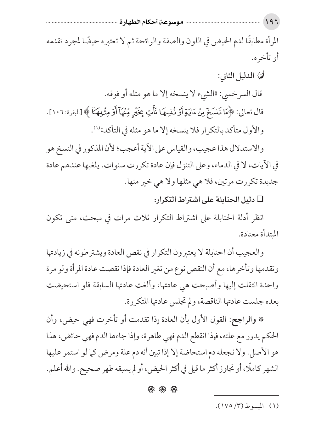 والاستدلال هذا عجيب، والقياس على الآية أعجب؛ لأن المذكور في النسخ هو في الآيات، لا في الدماء، وعلى التنزل فإن عادة تكررت سنوات. يلغيها عندهم عادة جديدة تكررت مرتين، فلا هي مثلها ولا هي خير منها.