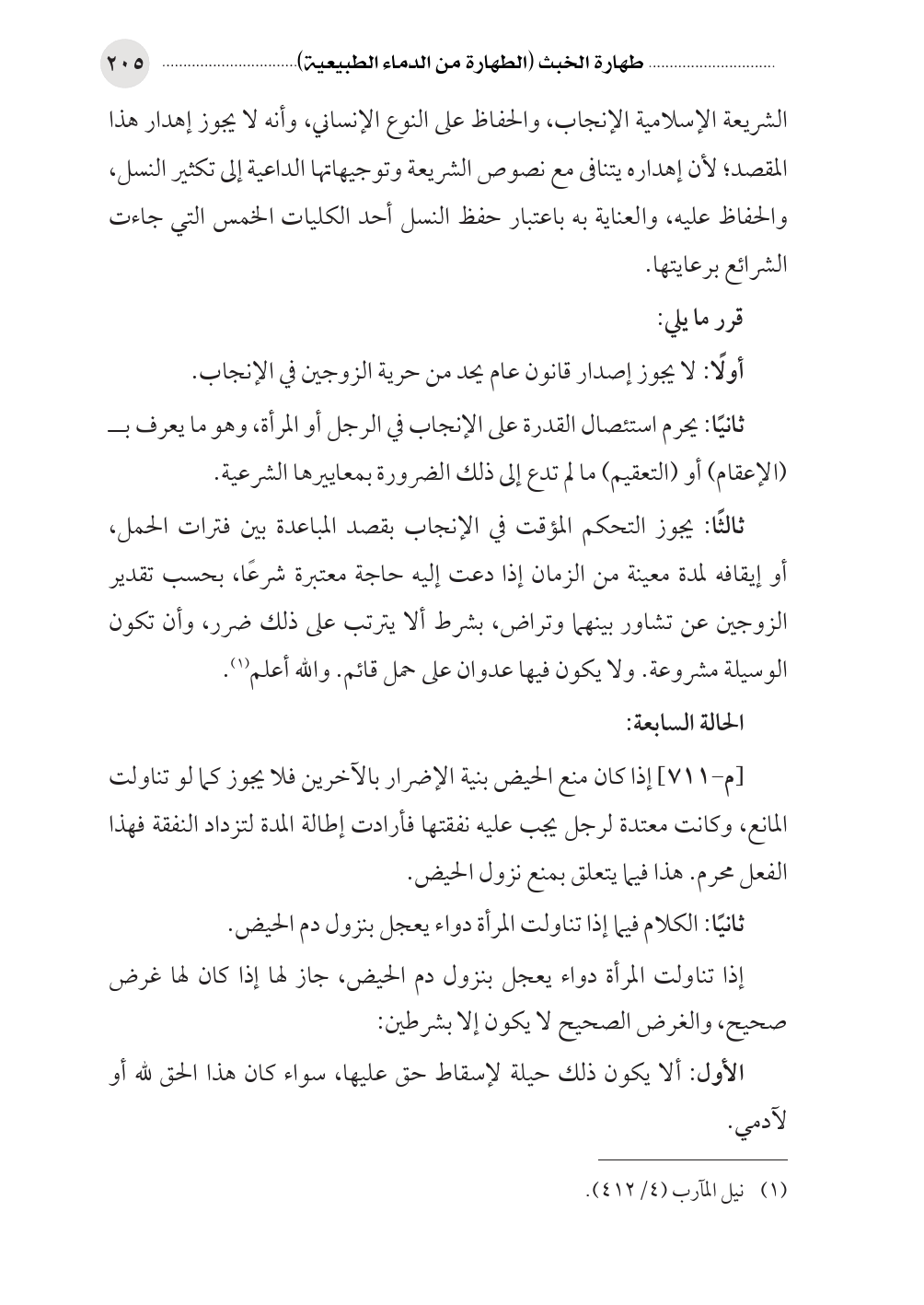 [م-٧١١] إذا كان منع الحيض بنية الإضرار بالآخرين فلا يجوز كما لو تناولت المانع، وكانت معتدة لرجل يجب عليه نفقتها فأرادت إطالة المدة لتزداد النفقة فهذا الفعل محرم. هذا فيما يتعلق بمنع نزول الحيض.