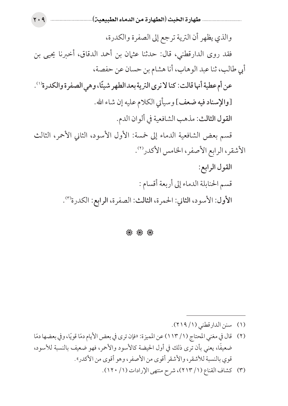 قسم بعض الشافعية الدماء إلى خمسة: الأول الأسود، الثاني الأحمر، الثالث الأشقر، الرابع الأصفر، الخامس الأكدر (¬٢).