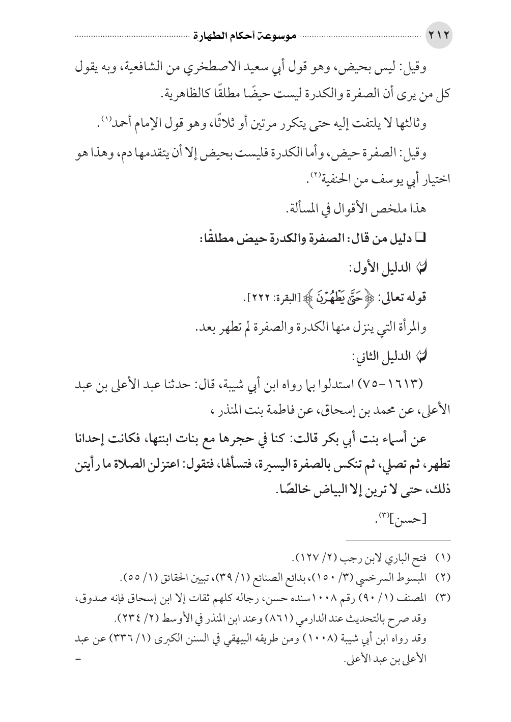 (١٦١٣ - ٧٥) استدلوا بما رواه ابن أبي شيبة، قال: حدثنا عبد الأعلى بن عبد الأعلى، عن محمد بن إسحاق، عن فاطمة بنت المنذر، عن أسماء بنت أبي بكر قالت: كنا في حجرها مع بنات ابنتها، فكانت إحدانا تطهر، ثم تصلي، ثم تنكس بالصفرة اليسيرة، فتسألها، فتقول: اعتزلن الصلاة ما رأيتن ذلك، حتى لا ترين إلا البياض خالصًا.