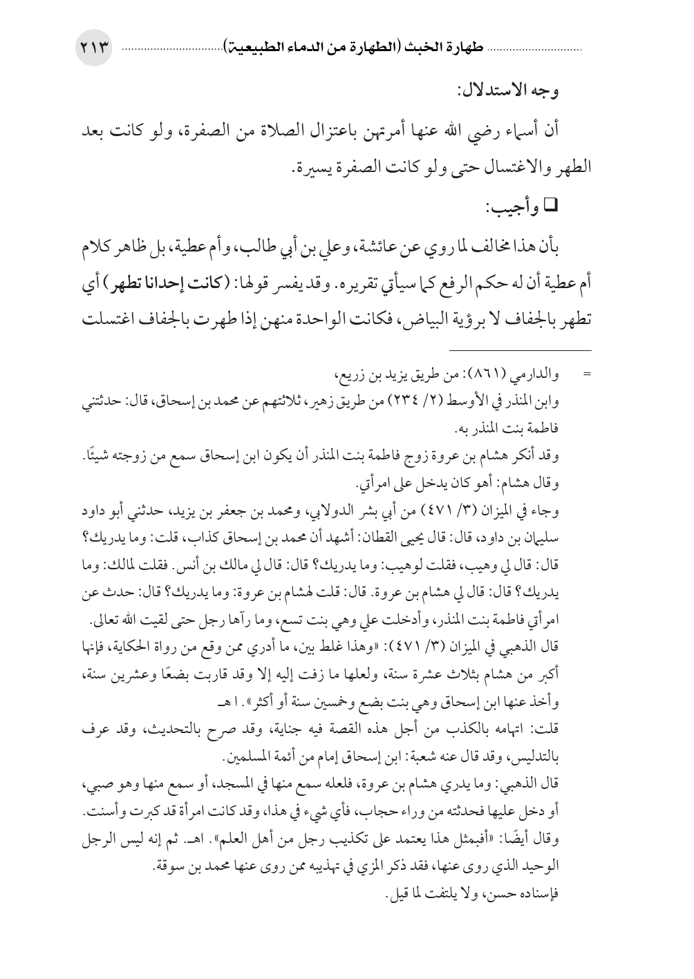 بأن هذا مخالف لما روي عن عائشة، وعلي بن أبي طالب، وأم عطية، بل ظاهر كلام أم عطية أن له حكم الرفع كما سيأتي تقريره. وقد يفسر قولها: (كانت إحدانا تطهر) أي تطهر بالجفاف لا برؤية البياض، فكانت الواحدة منهن إذا طهرت بالجفاف اغتسلت